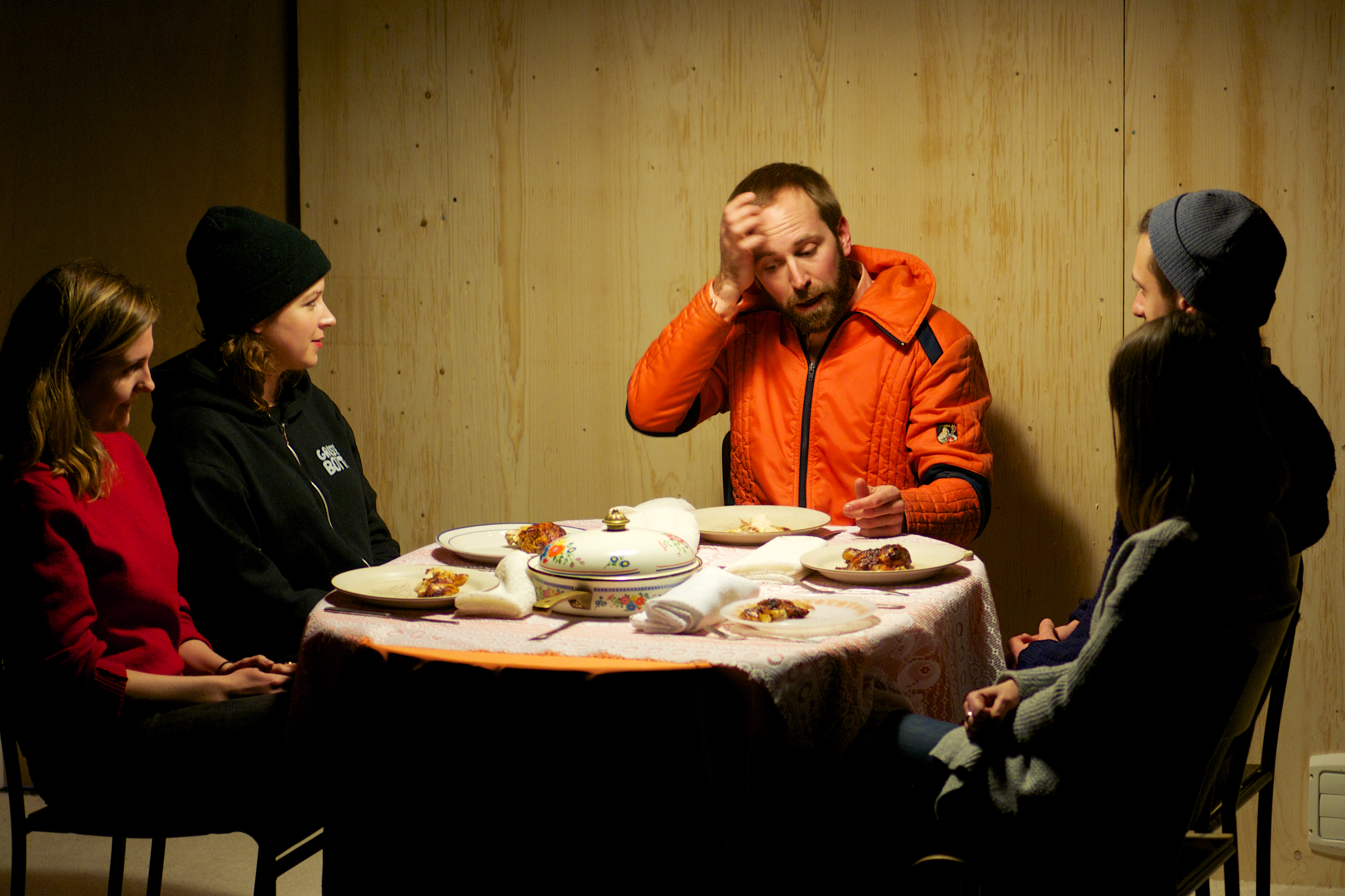 Invités par le comédien Simon-Pierre Lambert à partager un repas sur la scène, quatre spectateurs – et ultimement un d’entre eux – deviendront la matière de Ceci est un meurtre. Le résultat est un heureux mélange de malaise, de rires et d’inattendu.