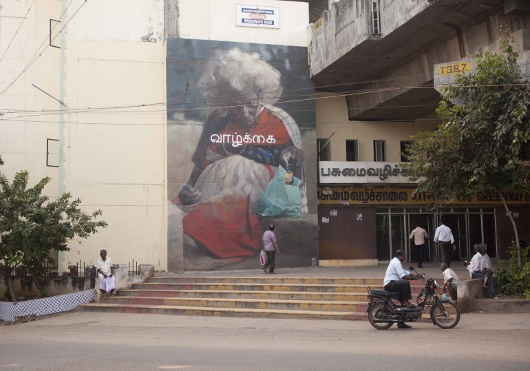 Prenons l’exemple de sa méga-murale Life, créée en février dernier à Chennai en Inde, à l’entrée de la station de train Greenways. Après avoir passé plusieurs jours à échanger avec les gens de ce quartier défavorisé, Void a arrêté son choix de portrait sur Krishnaveni, une dame itinérante d’un certain âge qui dort et vit devant le mur sur lequel l’artiste lui rend hommage. Sur son site web, Void explique «qu’à Chennai, on peint souvent des portraits de politiciens et d’acteurs afin de les glorifier», ce qui l’a poussé à aller à l’encontre de cette coutume. «Ma plus grande influence, ce n’est pas la peinture, mais plutôt les gens que je rencontre, nous dit-il lorsqu’on le joint à Berlin. Je viens d’une famille très hétéroclite: mon grand-père s’est battu pour Franco pendant la guerre civile espagnole, mon père était membre du parti communiste, et ma mère, Haïtienne, s’implique dans le mouvement pour les droits civils. Donc, j’essaie peut-être de trouver un point de convergence, et la forme de journalisme visuel que je pratique s’impose pour offrir un reflet de la société.»