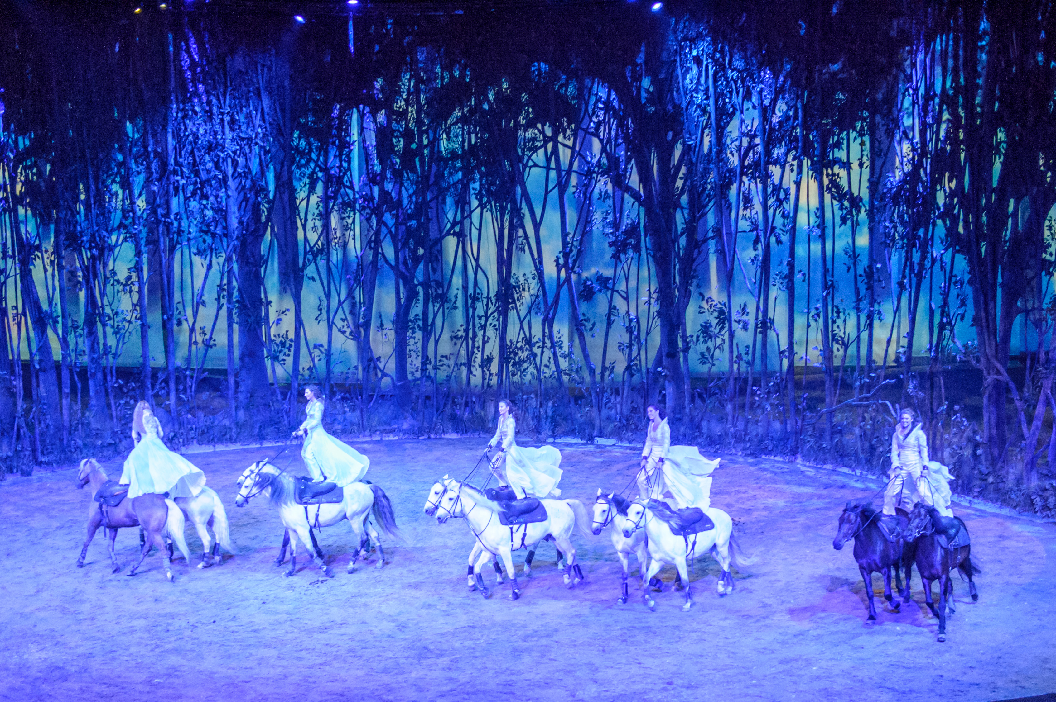 La montagne surélevée à l’entrée arrière de la scène permet une verticalité aux chorégraphies. Avec 300 commandes techniques à dicter, le spectacle propose une expérience en soi. Rien n’est commandé automatiquement en raison des chevaux qui peuvent parfois avoir quelques petits écarts dans leur routine pourtant bien apprise. Comme quoi le naturel revient parfois au galop.