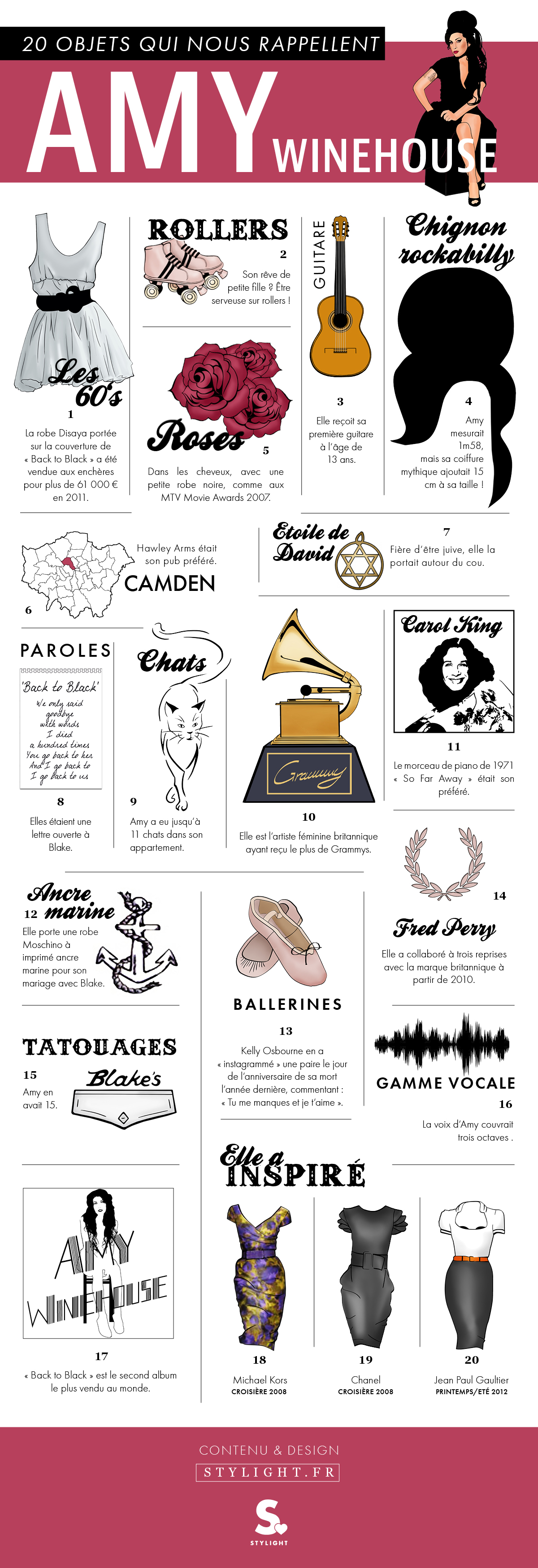 À l’occasion de la sortie du documentaire Amy du réalisateur Asif Kapadia, l’équipe éditoriale de Stylight.fr revient sur 20 objets iconiques qui nous rappellent Amy Winehouse et son style inimitable.