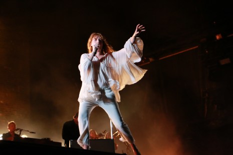 Alors que la foule réclamait «Florence, Florence, Florence», le show a été lancé de manière soudaine par une série de feux d’artifice tirés au-dessus de la scène, prenant la foule par surprise. Et puis, tout de suite après, le calme. Et là, tel un ange, Florence Welch est apparue, pieds nus et tout de blanc vêtue, en chantant What The Water Gave Me.
