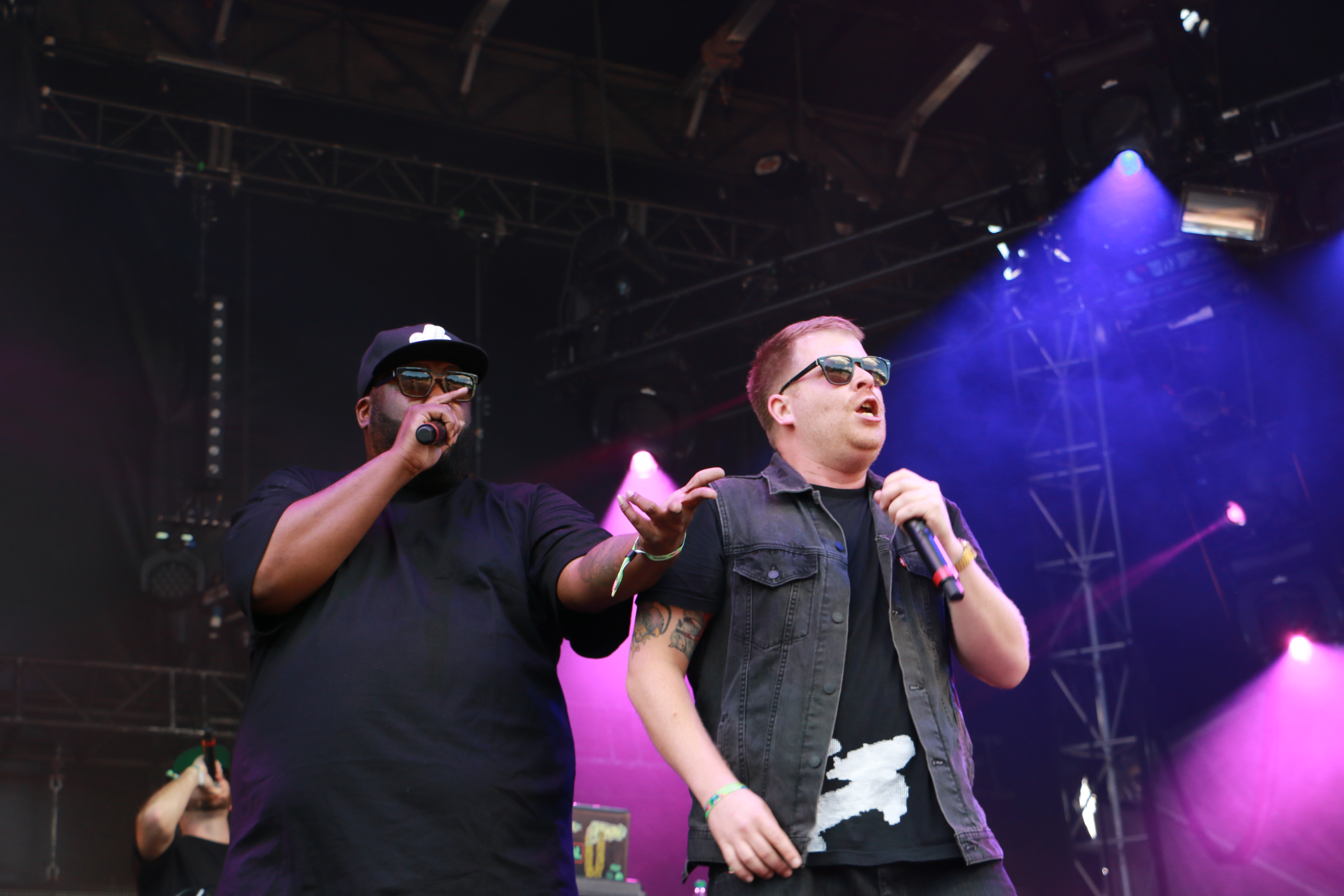 Calotte des Expos sur la tête, le rappeur de Run the Jewels s’est vite emparé du micro pour annoncer que lui et son comparse, El-P, allait «fu*k this fu*king festival up». Puis, ledit El-P est monté sur scène à son tour, l’a pris dans ses bras, tape dans le dos, tape dans le dos, et le fu*king up du fu*king festival a commencé.