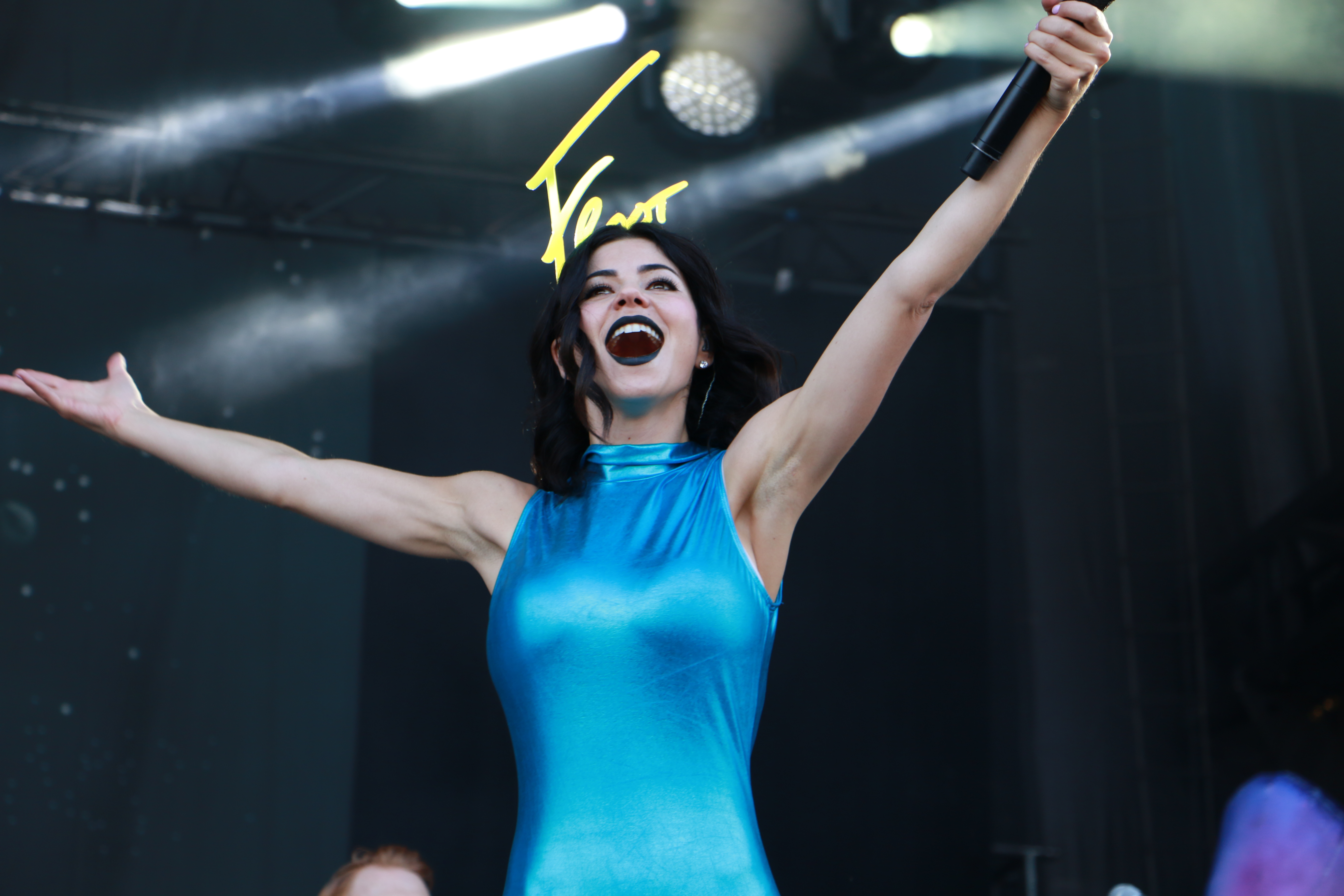 Elle est débarquée telle une jolie extraterrestre dans sa combinaison bleu électrique et ses sandales à plateformes lunaires roses. Et même si elle portait un bandeau sur lequel on pouvait lire le mot «Froot», titre qui coiffe aussi son nouvel album, c’est avec un vieux tube, Bubblegum Bitch, que Marina a lancé son set. «Uh oh, uh oh, oh!»