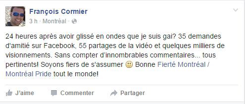 Ici, je ne souligne pas le courage de François Cormier, ni l’audace d’un «coming-out», pas du tout. Je souligne qu’enfin, on peut en parler comme ça, comme on parle d’aller faire son marché. Et ça fait du bien.