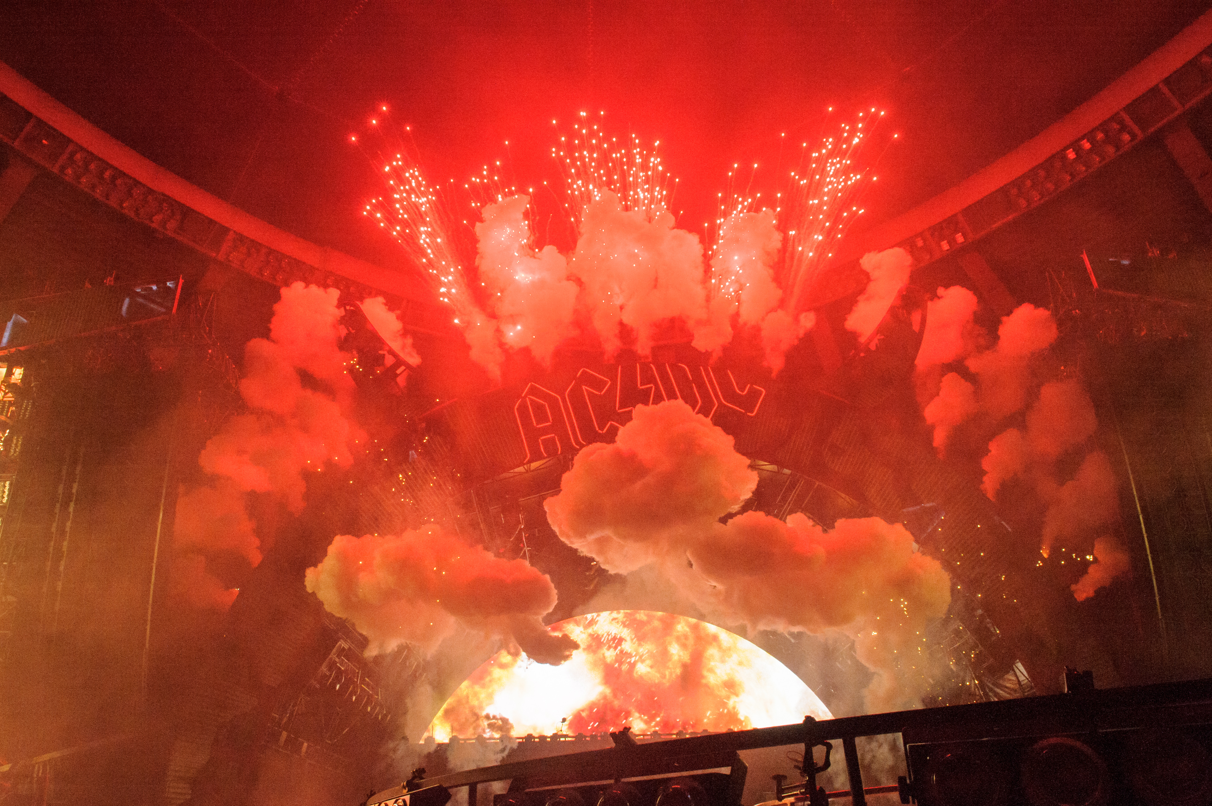 Tandis que Chris Slade se défonçait au drum, on a eu droit à la totale avec Thunderstruck, agrémentée d’éclairs et rythmée par le martèlement des cris de «Thunder!» que, parenthèse, pour une raison obscure, on a passé toute notre jeunesse à déformer en «Fuck you!» (pas tant pour cause de rébellion que pour cause de «on était sûre que c’est ça qu’il chantait». Mmm, quoi, ça sonne pareil!). On a également communié à l’autel des riffs de l’apocalypse, tandis que résonnaient les cloches des enfers de Hells Bells. Puis, les murs ont tremblé pendant You Shook Me All Night Long, et son imbattable métaphore de sexy moteur. Éclairée par les scintillements – allumé-pas-allumé-allumé-pas-allumé – des cornes rouges démoniaques portées par une majorité de fidèles, la salle avait de l’ambiance et du tonus. Particulièrement pendant les «Oh! Oh!» répétés en intro de T.N.T., qui s’est élevée au rang de chant angélique grâce au jeu de guit majestueux d’Angus. De la dynamite.