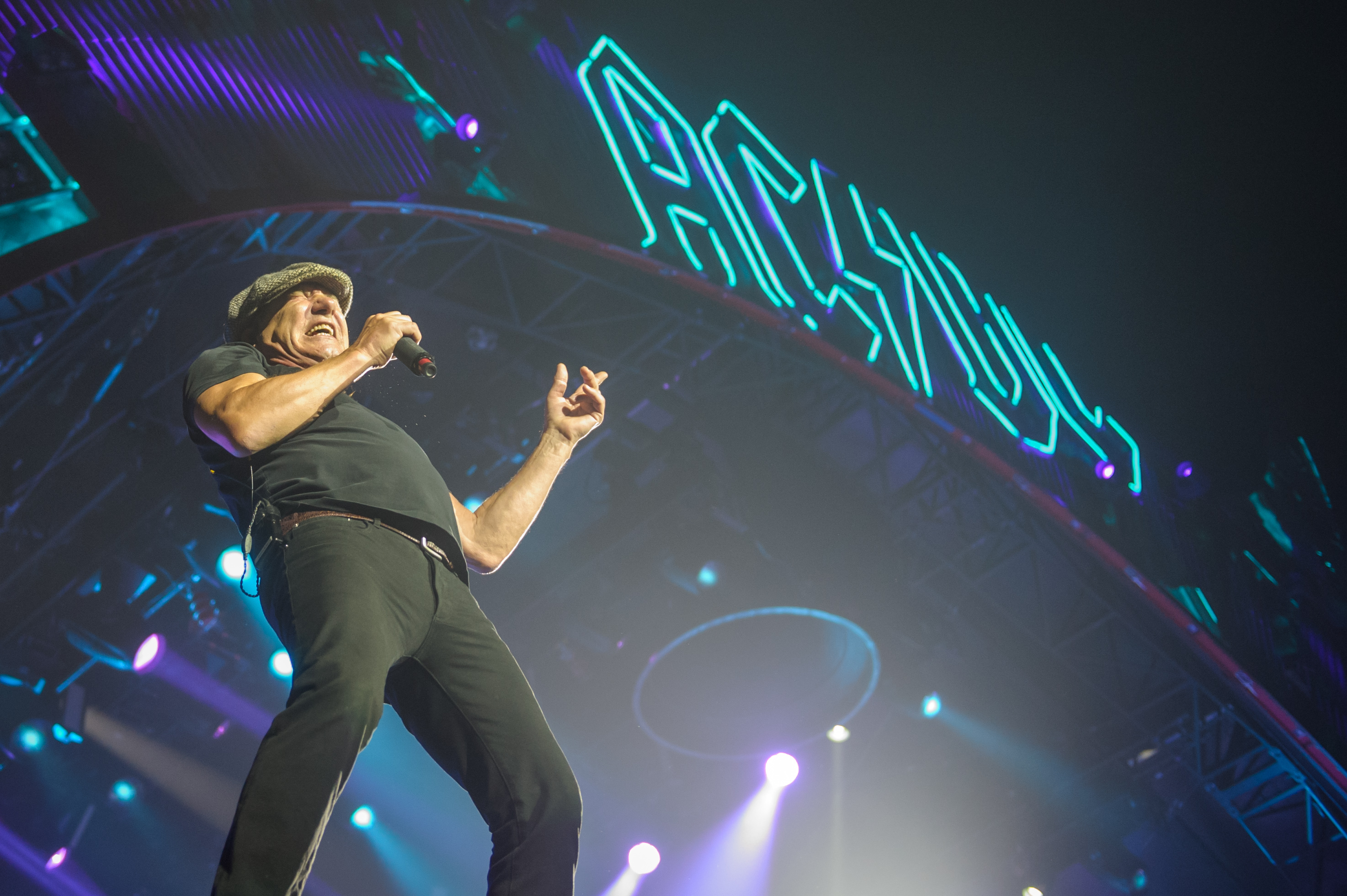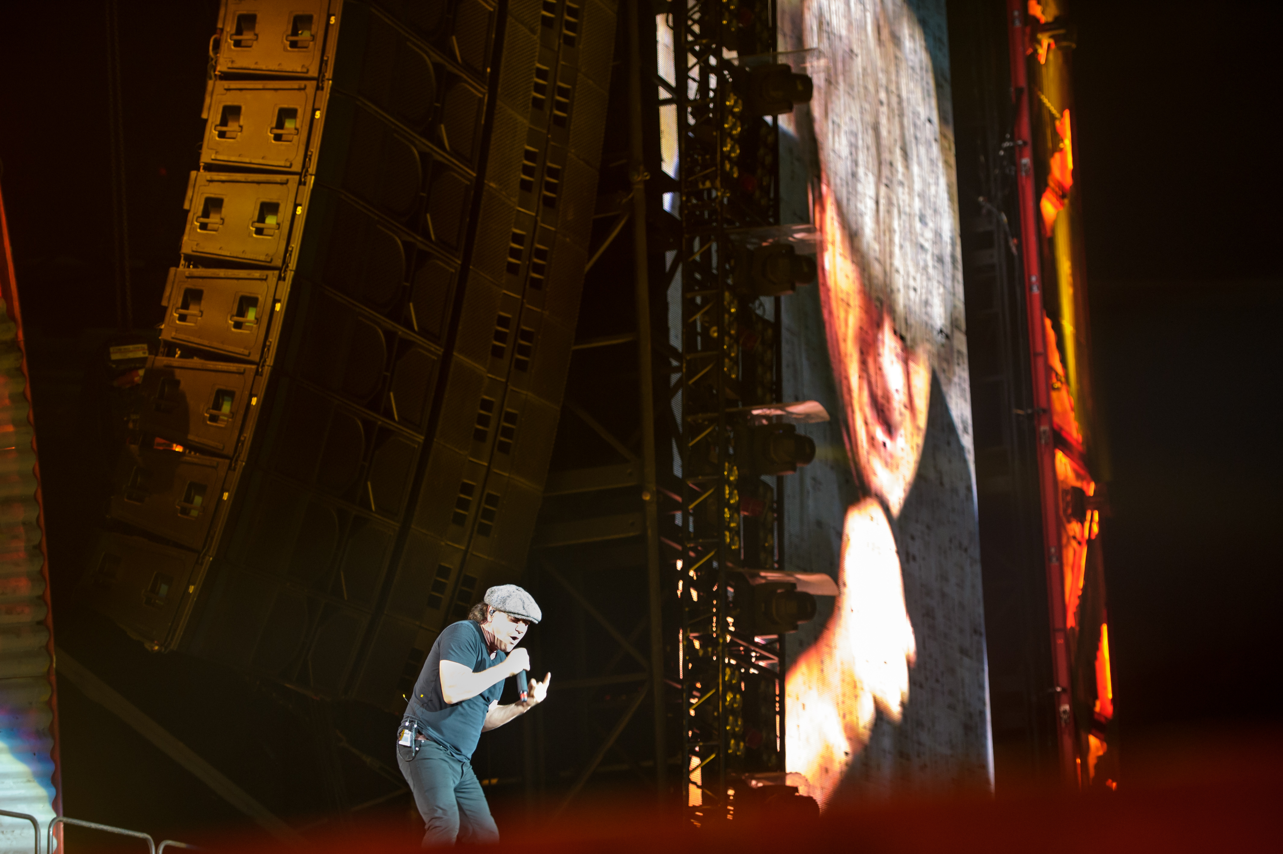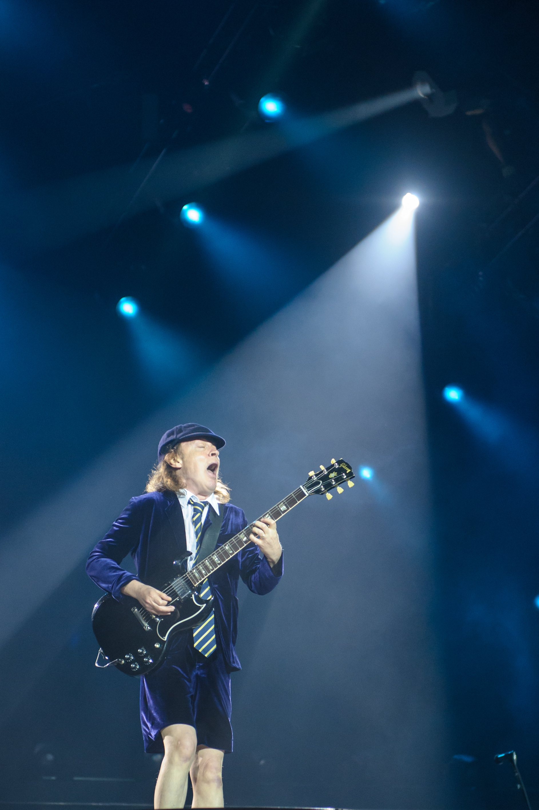 À 20h45 tapantes, après une intro tout en météorites, en explosion, en feux d’artifice et en fumée, Angus est entré en sautillant, les gambettes à l’air dans ses éternels shorts et son uniforme de vilain écolier («Oh, Angus, t’as encore foxé le cours d’algèbre»). Entrée également remarquée? Celle de Brian Johnson, de sa calotte, de sa voix inimitable et de sa forme olympique, adaptée à la scène sur laquelle il se produisait (celle du Stade, donc).