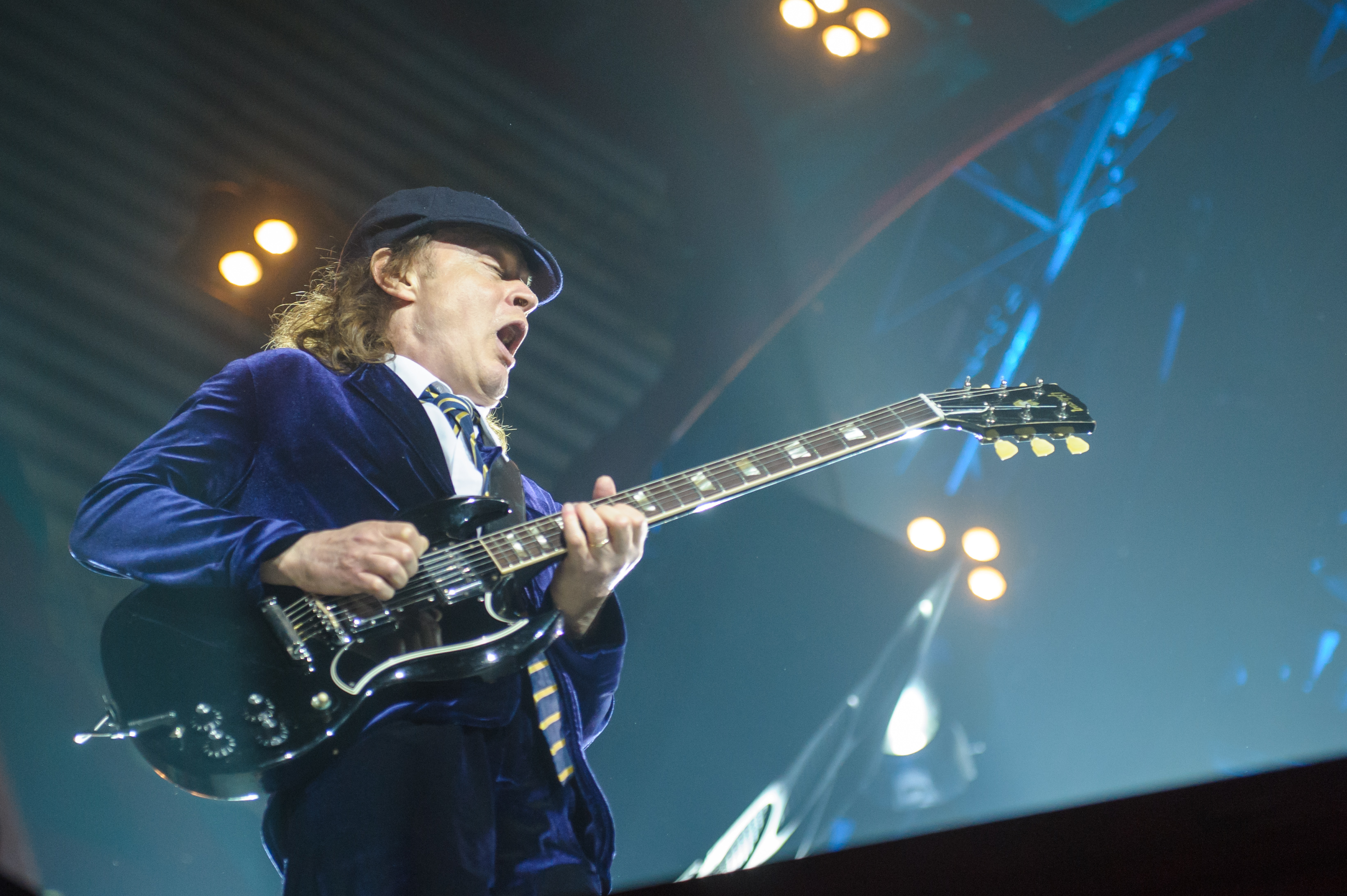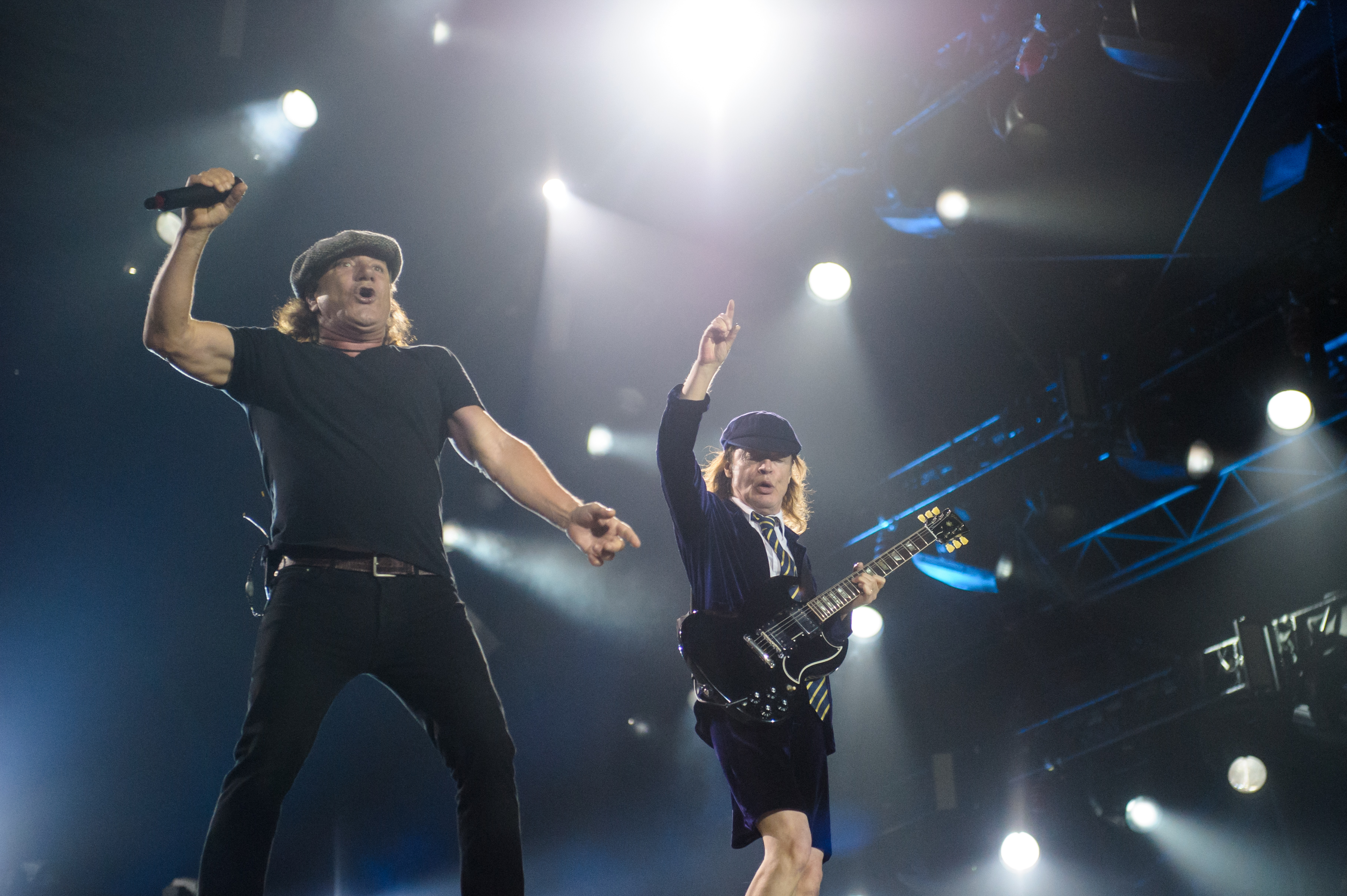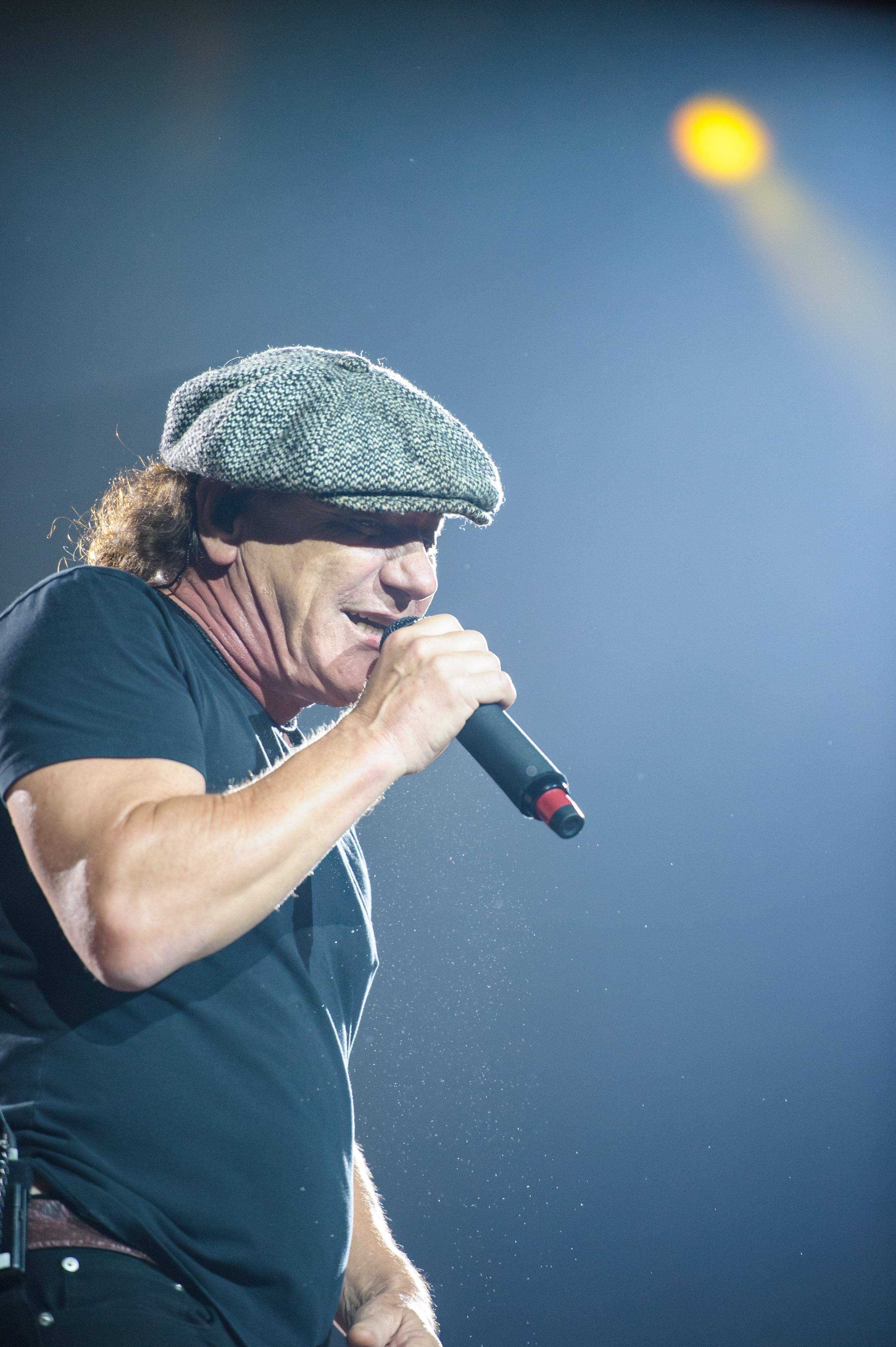 À 20h45 tapantes, après une intro tout en météorites, en explosion, en feux d’artifice et en fumée, Angus est entré en sautillant, les gambettes à l’air dans ses éternels shorts et son uniforme de vilain écolier («Oh, Angus, t’as encore foxé le cours d’algèbre»). Entrée également remarquée? Celle de Brian Johnson, de sa calotte, de sa voix inimitable et de sa forme olympique, adaptée à la scène sur laquelle il se produisait (celle du Stade, donc).