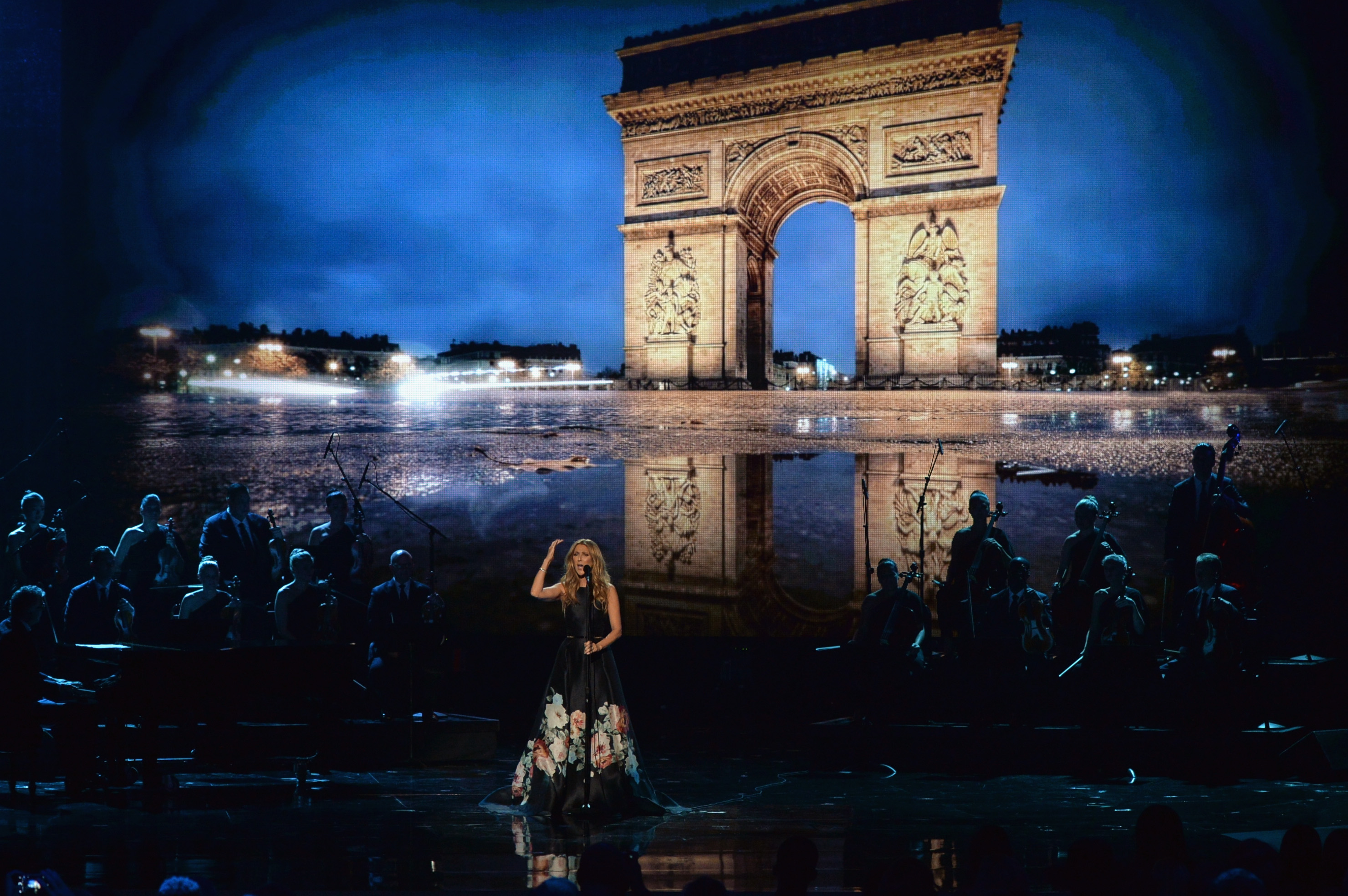 La star québécoise, qui était vêtue d’une robe noire à fleurs, a chanté en compagnie d’un orchestre, tandis que des images des rues de Paris et des recueillements étaient diffusées en arrière-plan.