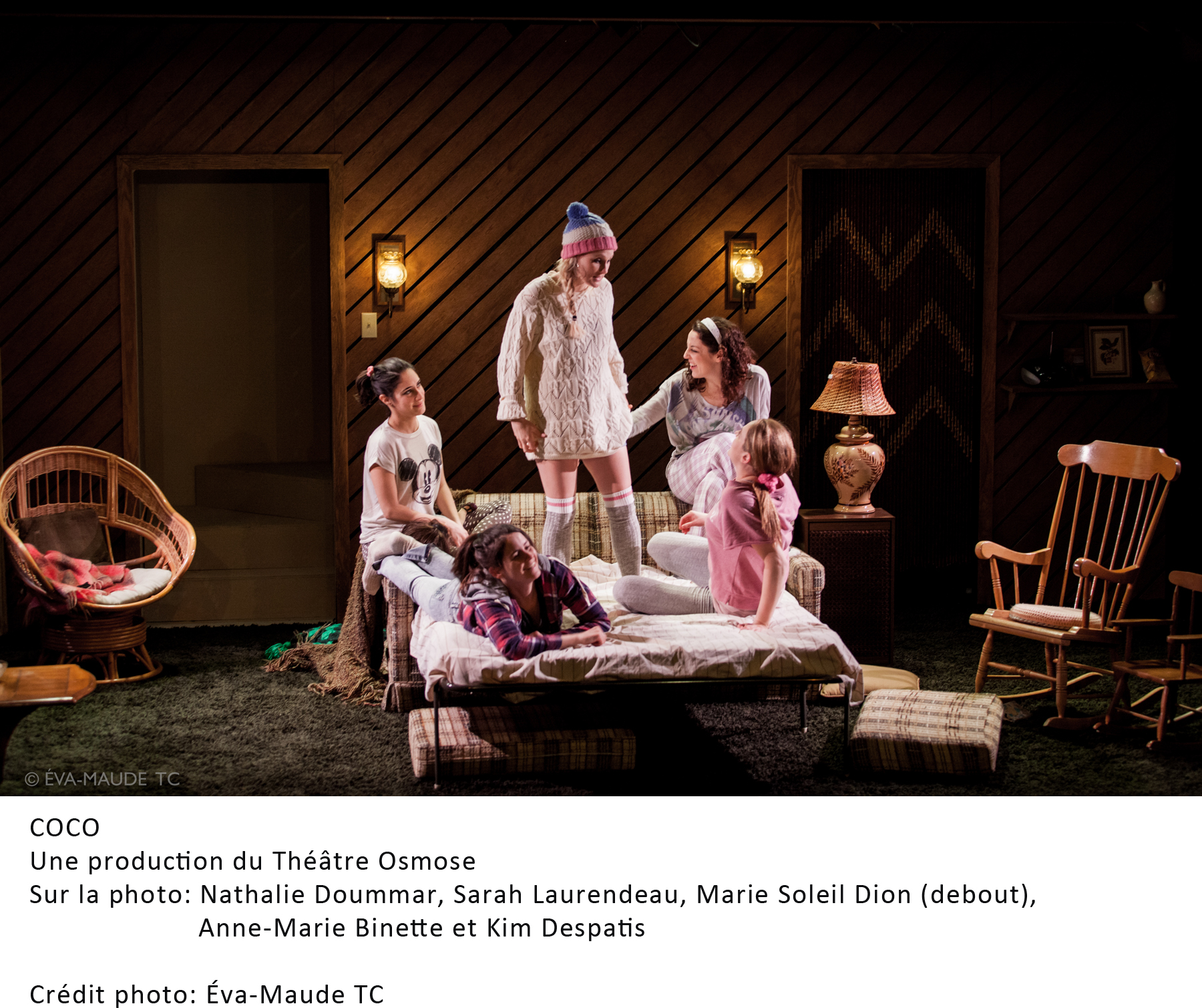 Cinq copines à divers moments de leur amitié. Avant, avec des chouchous roses dans les cheveux et des t-shirts de Mickette. Après, avec des shooters de liquide vert à la main. Maintenant, quand l’une d’entre elles est partie. Trop vite. Mis en scène par Mathieu Quesnel, ce premier texte de Nathalie Doummar, qui incarne avec sensibilité la Coco du titre, a tout bon. Le décor du chalet où les filles se retrouvent, le divan-lit qui s’ouvre et se referme mal, le linge d’intérieur, la chemise à carreaux et les gros bas de laine. Il y a aussi le casting irréprochable et les clins d’œil drolatiques, comme cette préado qui fait du pseudo break dance en soufflant fort. Puis ces minutes où le noir se fait et où les confidences des actrices déboulent. Sans oublier ces passages où elles redeviennent petites, où l’une d’entre elles s’invente un amoureux, «Gary Berth qui va à l’école St-Berthélémy», où elles parlent du plus beau gars de la classe, ÉMILE RACINE. «Eeeeew, ses tibias sont comme, super longs!» Et même s’il est question de sujets lourds, l’ambiance ne l’est jamais. Le genre de moments impeccables pour lesquels on va au théâtre. À La Licorne jusqu’au 20 février, avec Sarah Laurendeau, Nathalie Doummar, Marie-Soleil Dion, Anne-Marie Binette et Kim Despatis. (Natalia Wysocka)