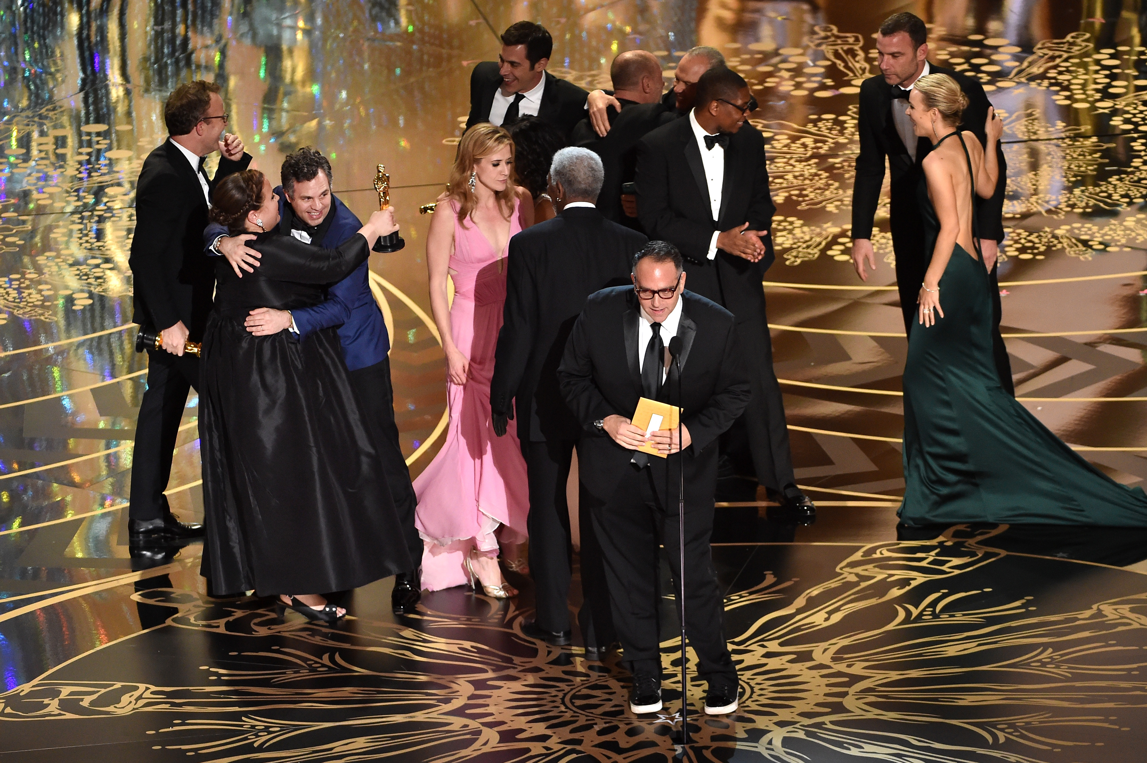 Emily et Charlize ont alors annoncé que, grande première, «l’ordre des gagnants suivrait les étapes dans lesquelles les films sont faits». Ainsi, tout a commencé par le Meilleur scénario, décerné à Tom McCarthy pour Spotlight. Puis, le Meilleur scénario adapté, présenté par Russell Crowe et Ryan Gosling en mode «fausse chicane», a été remis à Charles Randolph et Adam McKay pour The Big Short.