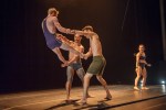 Contrairement aux spectacles vus jusqu’à présent à Montréal complètement cirque, Knee Deep ne repose pas sur un quelconque fil narratif, mais simplement sur les numéros présentés sur une scène sobre par les trois garçons et la fille de la bande, et franchement, personne ne s’en est plaint.