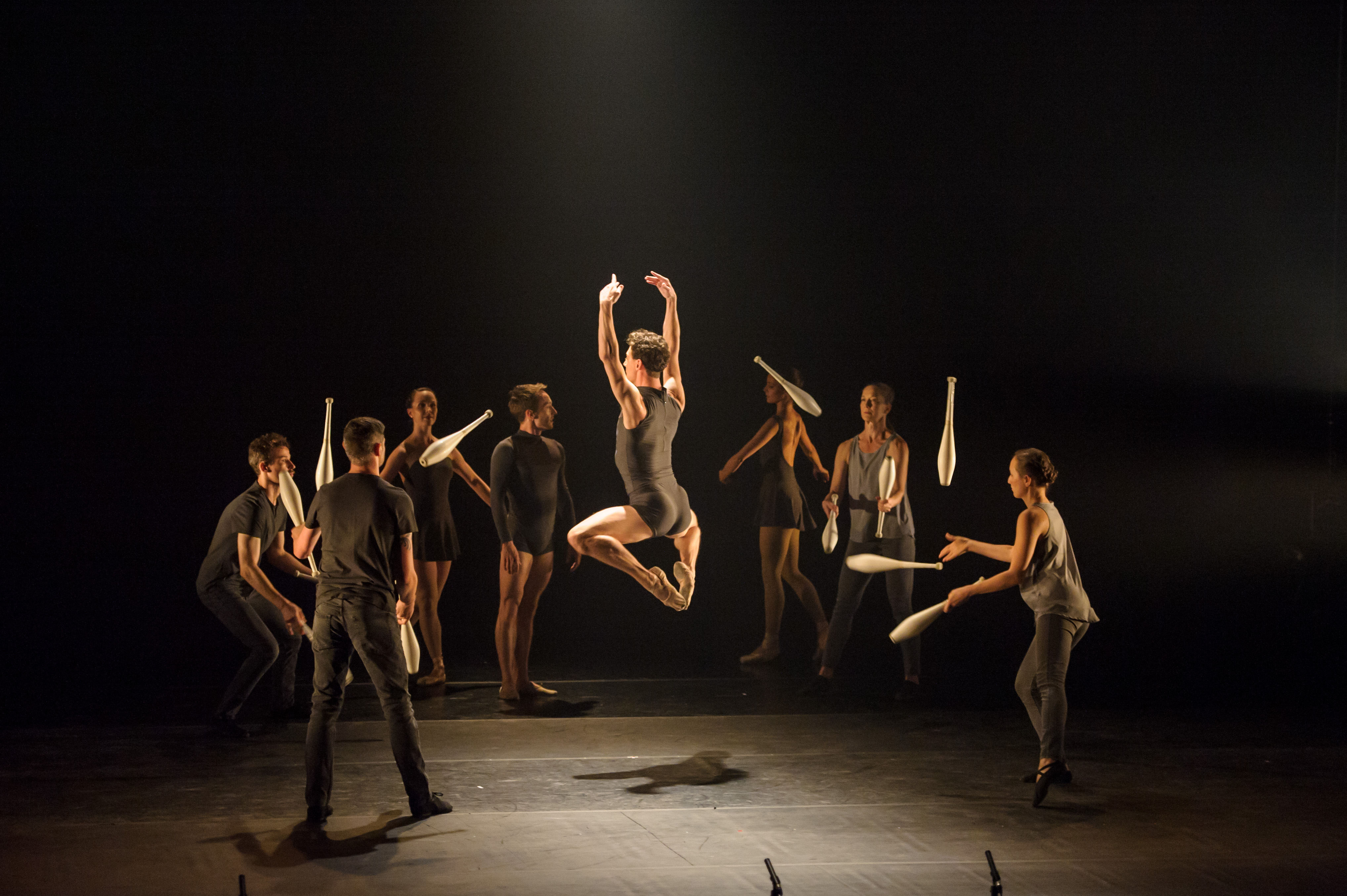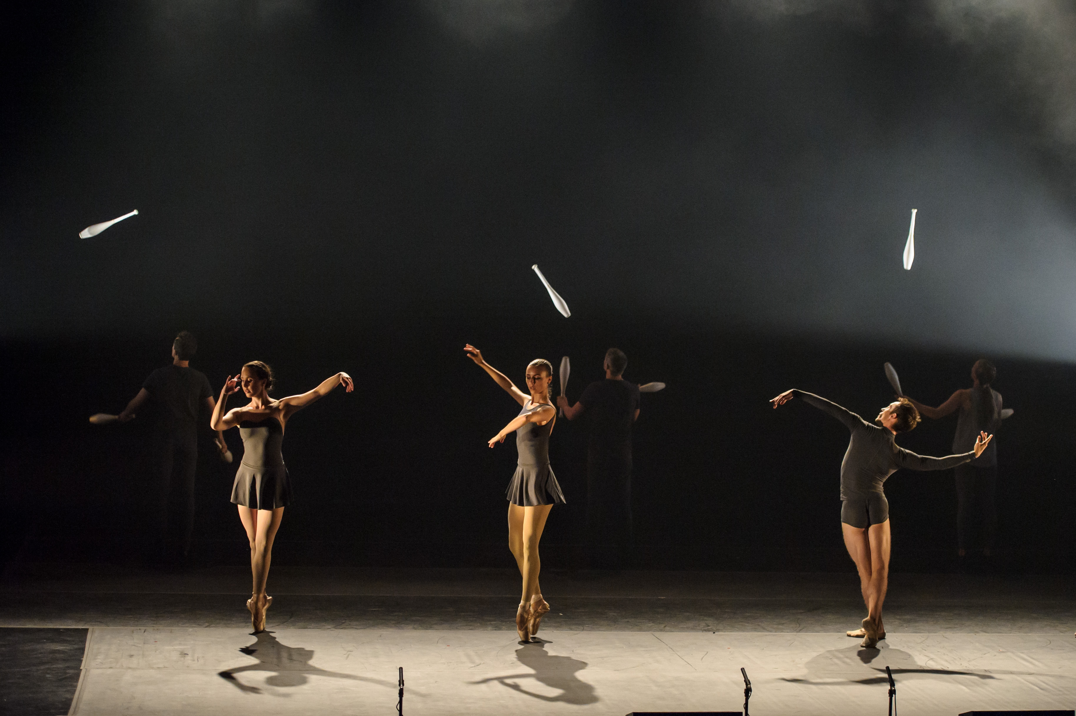 La jonglerie et le ballet : deux disciplines qui donnent l’impression que ceux qui les pratiquent défient les lois de la gravité. Deux arts qui, sur scène, donnent une trompeuse et jouissive impression de facilité et qui incluent une dimension mathématique à leur pratique. Le spectacle s’ouvre d’ailleurs sur les quatre jongleurs et les quatre danseurs qui lancent des chiffres, des indications de hauteur ou de position, créant une véritable trame sonore a capella.