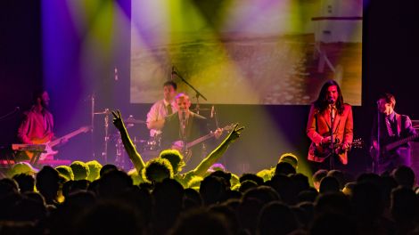 Sur l’écran derrière les musiciens sont projetées des images parfois psychédéliques, parfois comiques, comme des dessins animés d’animaux de la ferme ou un montage humoristique de P’tit Belliveau qui fait un combat de boxe.