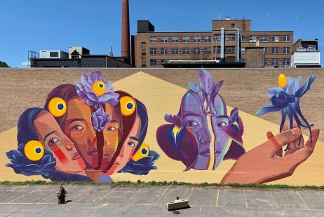 Cette œuvre a été peinte par l’artiste Gleo dans le cadre du festival MURAL le printemps dernier. Née à Cali, en Colombie, l’artiste visuelle aime conjuguer légendes sud-américaines et art urbain. Sur la murale Metamorphosis, on peut voir plusieurs fois le visage d’une femme ainsi que de gros yeux jaunes et des fleurs dans une palette de couleurs contrastée. Les fleurs, les couleurs, les yeux, les tatouages et les formes géométriques sont des symboles très caractéristiques des œuvres de Gleo.