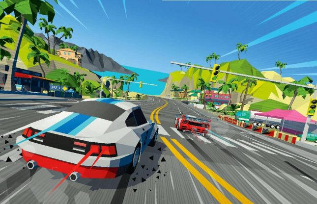 Difficile de trouver un jeu de course plus « Sega » que Hotshot Racing. Le style polygonal à la Virtua Racing, les dérapages quasi perpendiculaires à la piste comme dans Outrun, l’annonceur qui crie « Time extended », une trame sonore rock très « Sega Rally », le tout par le studio derrière les Sonic All-Star Racing. Ça démarre en force!
