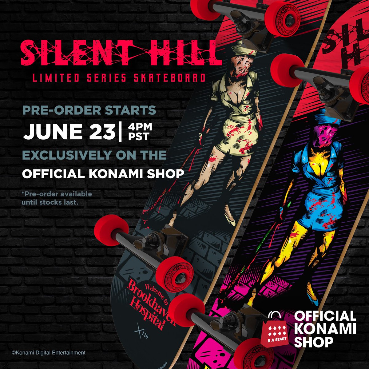 Au moins, nous savons que Konami pense encore à la série. Les Silent Hill Skateboards seront offerts à compter du 23 juin prochain en deux éditions : standard (quantité : 120) et Nightmare (quantité : 25). Le coût de ces planches stylées n’a pas encore été dévoilé.