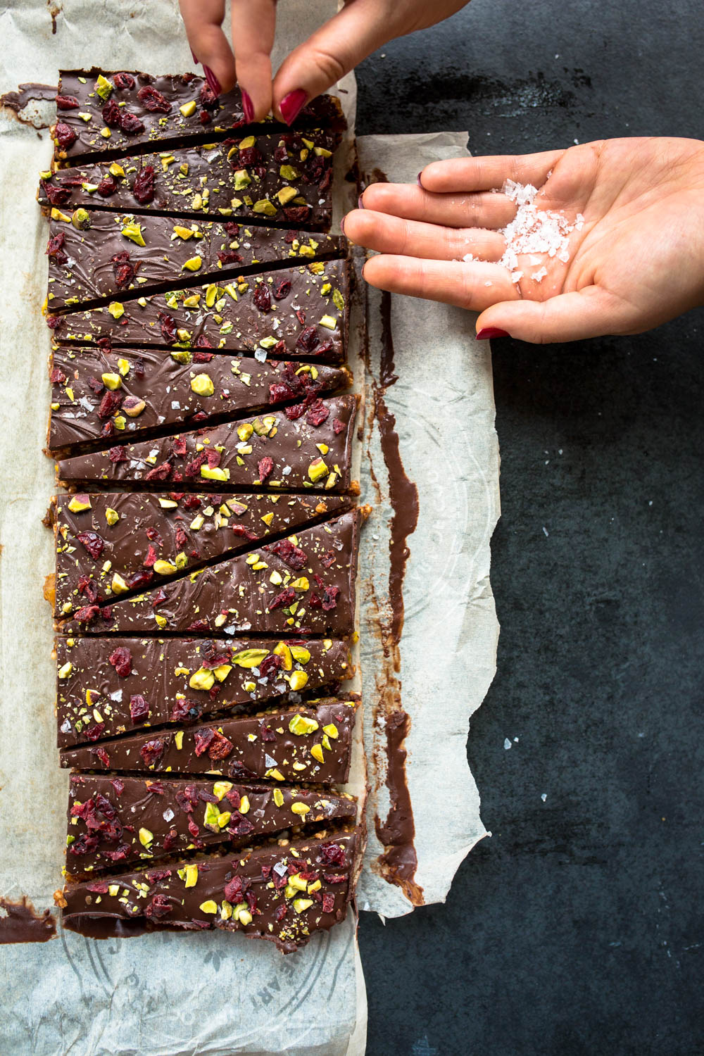 - Dans un bol allant au micro-ondes, faire fondre le chocolat noir avec la margarine pendant 1 minute. Brasser doucement et chauffer encore 20 secondes si le chocolat n’est pas complètement fondu. Verser sur la préparation et étendre le chocolat avec une spatule coudée. Saupoudrer de pistaches, de cerises séchées et de fleur de sel.