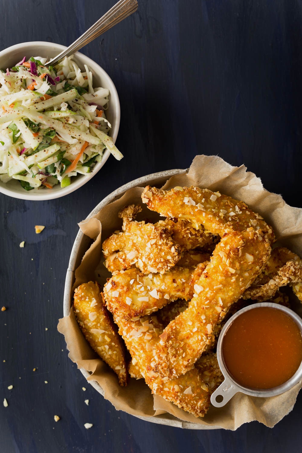Des doigts de poulet maison, c’est toujours bon! Pour que la chapelure tienne bien, j’ai utilisé de la mayonnaise assaisonnée comme liant et c’est un truc à retenir! La chapelure est vraiment délicieuse avec des amandes et des Rice Krispies au riz brun sans gluten broyé. Ne vous posez pas de questions, ce repas marquera des points auprès de tous les membres de la famille!!