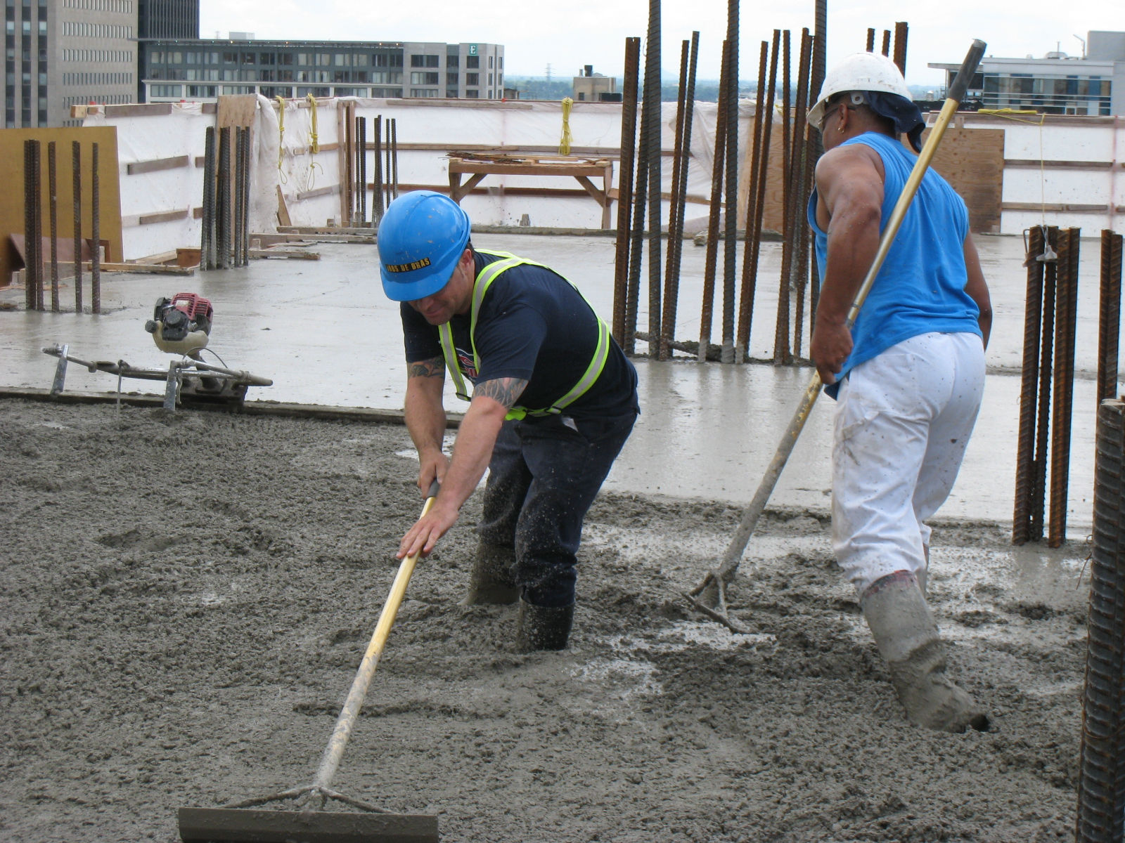Dans le cas d’un plancher, par exemple, des manœuvres se dépêchent pour bien étendre le béton avec des râteaux-pelles. Ce faisant, ils doivent s’assurer que la couche de béton ait l’épaisseur désirée… tout en faisant attention de ne pas s’empêtrer dans le matériau durcissant ni dans l’armature de métal qu’il recouvre.