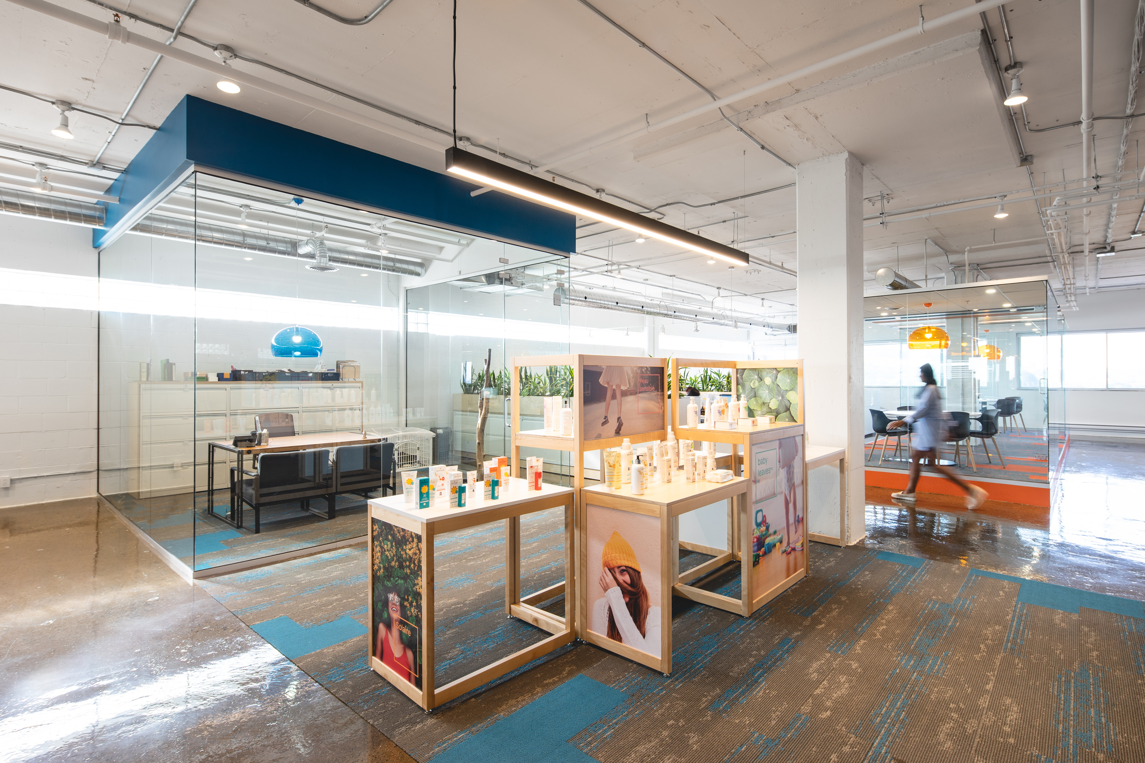 Établie dans le Mile-End depuis ses débuts, Attitude a emménagé dans de nouveaux bureaux l’année passée. L’espace à aire ouverte imaginé par le studio de design Bipède au neuvième étage d’un édifice de la rue de Gaspé est doté de grandes fenêtres sur trois côtés. La lumière naturelle y est certes abondante, mais on retient surtout la vue sur le mont Royal d’un côté, et sur le Stade olympique de l’autre. L’organisation spatiale très ouverte et transparente – l’espace de 8 065 pi2 comprend des cubicules entièrement vitrés – laisse d’ailleurs passer la lumière où qu’on se trouve, même dans le laboratoire, où sont élaborées les formules de la marque. Enfin, une vaste aire de repos intégrant des jeux de table, des balançoires, un lounge et une cuisine moderne a été pensée pour le bien-être des employés.