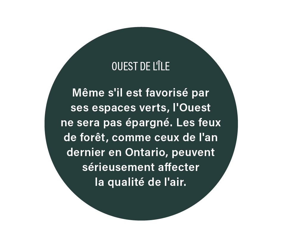 Les Montréalais se souviennent sans doute de l’air brumeux, de l’odeur de fumée et de la lune orangée de juillet causés par les feux de forêt du nord de l’Ontario. Des experts prévoient qu’en raison des hausses de température, de tels épisodes de smog risquent de devenir plus intenses et plus fréquents. Même si les feux sont lointains, leurs effets sur la qualité de l’air se feront sentir à Montréal, particulièrement dans l’est de la métropole.
