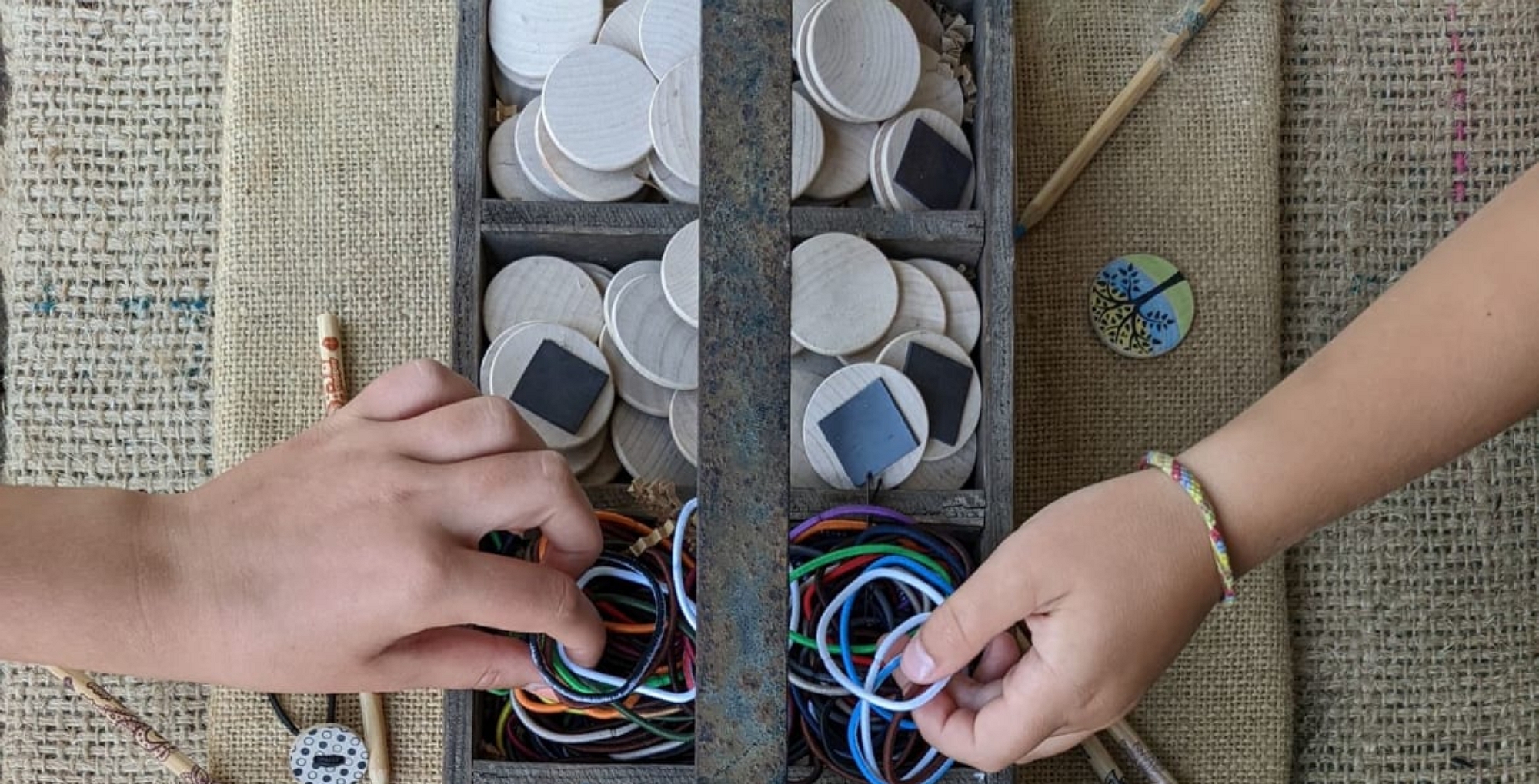 Lors de cet atelier créatif, chacun aura le choix de confectionner deux objets en bois parmi les suivants: élastique à cheveux, porte-clés, aimant ou toupie, puis de les décorer à l’aide de tampons encreurs et de crayons de bois.