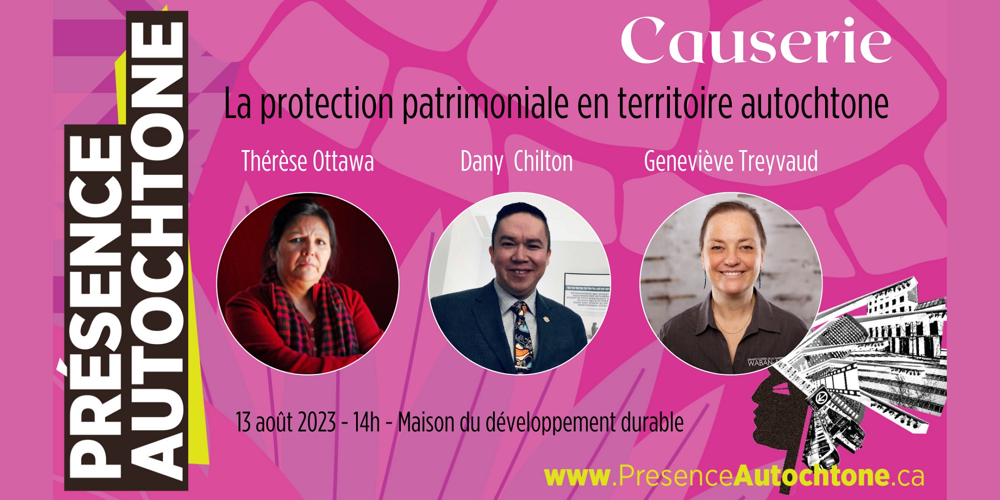 Le 33e Festival international Présence autochtone est heureux de présenter une causerie sur le thème de la protection patrimoniale en territoire autochtone avec Thérèse Ottawa, Constant Awashish et Geneviève Treyvaud le dimanche 13 août à 14 h à la Maison du développement durable de Montréal.