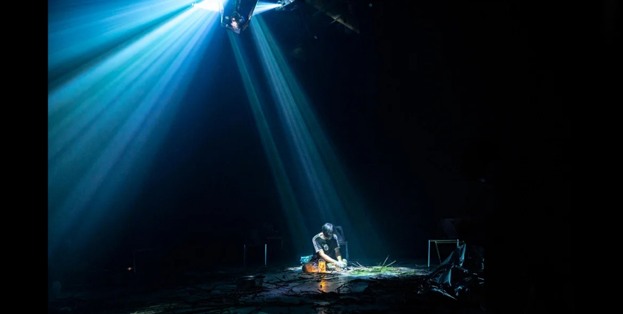 Les yeux bandés, l’artiste inuit Simiuni Nauya, qui est le cœur de l’œuvre, sculpte parmi les éclats lumineux et sonores. Dans cet espace atemporel, le spectateur est invité à choisir l’heure de son arrivée et le moment de son départ.