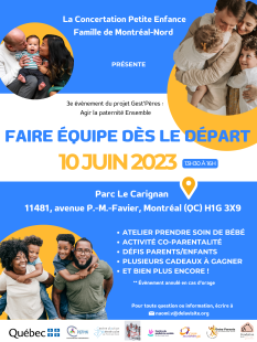 C’est sur le thème “Faire équipe dès le départ » qu’aura lieu le 3ème évènement collectif du projet Gest’Pères. L’activité se déroulera le 10 juin prochain de 13h30 à 16h00 au Parc Le Carignan.