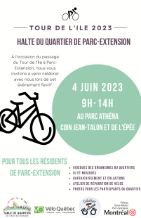 À l’occasion du Tour de l’Île de Montréal, les organismes de Parc-Extension invitent les participants à découvrir les initiatives locales du quartier. Ils encouragent également les résidents à venir célébrer le passage des cyclistes.