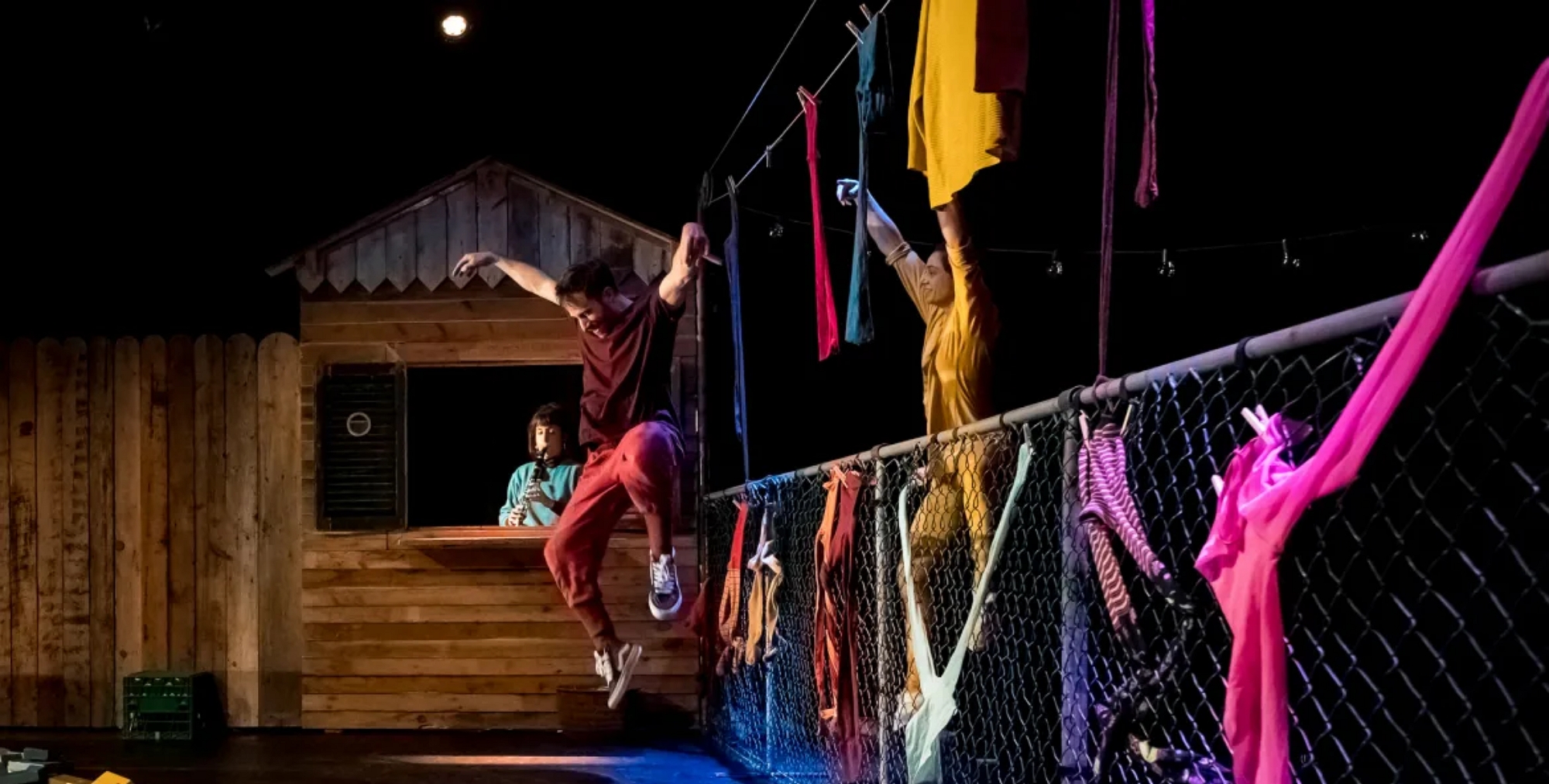Abordant les concepts de territoires, d’espaces et de cloisons, l’espace de jeu est circonscrit par une palissade de bois et une clôture de mailles. Claquemurés à cette cour, deux acolytes se plaisent à construire et déconstruire sculptures, tissages, lieux et parcours, avec les blocs de bois et vêtements à leur portée. À travers la fenêtre, la voisine musicienne accompagne à son insu les méandres de leurs créations et de leur relation.