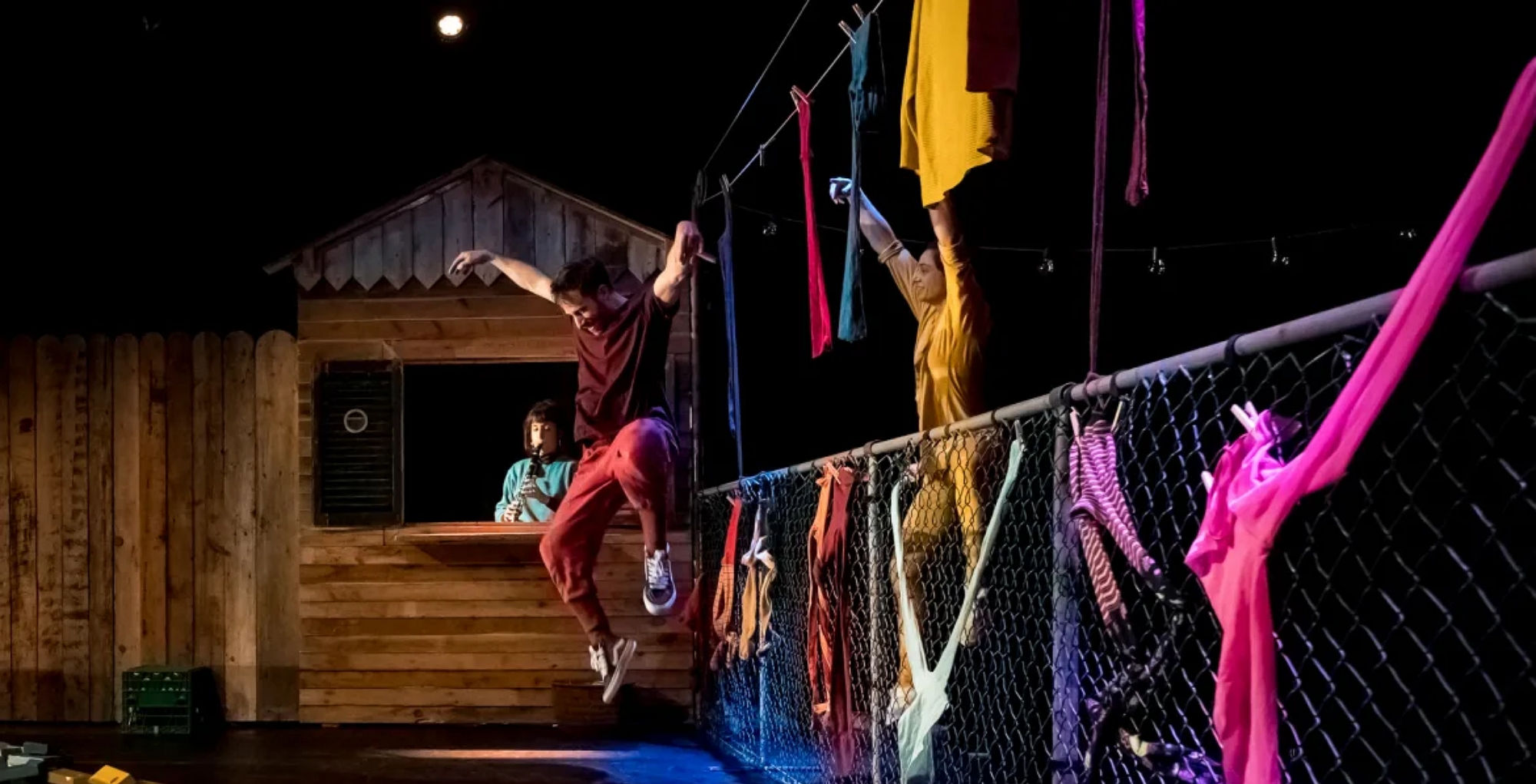 Abordant les concepts de territoires, d’espaces et de cloisons, l’aire de jeu est circonscrite par une palissade de bois et une clôture à mailles de chaîne. Claquemurés dans cette cour, deux acolytes se plaisent à construire et à déconstruire sculptures, tissages, lieux et parcours avec les blocs de bois et les vêtements à leur portée. À travers la fenêtre, la voisine musicienne accompagne à son insu les méandres de leurs créations et de leur relation.