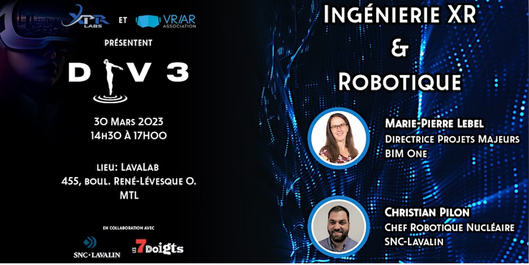 Ne manquez pas les conférenciers Marie-Pierre Lebel & Christian Pilon qui nous parleront des technologies XR dans l’industrie de l’ingénierie et de la robotique.