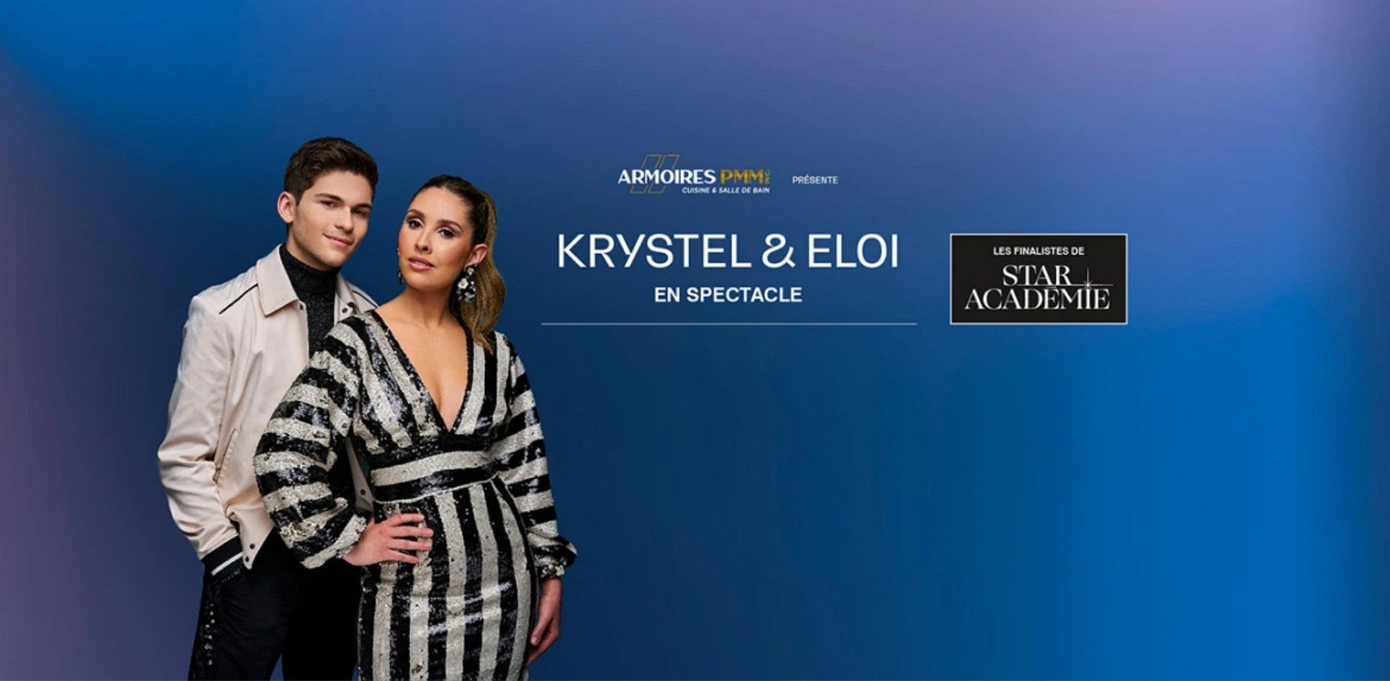 Armoires PMM est fier de présenter la tournée des finalistes de Star Académie 2022. Après avoir séduit le Québec pendant 12 semaines sur les ondes de TVA, Krystel Mongeau et Éloi Cummings iront à votre rencontre lors d’une grande tournée de spectacles, laquelle les mènera à travers le Québec. C’est ainsi en double plateau qu’ils vous offriront leurs univers musicaux.