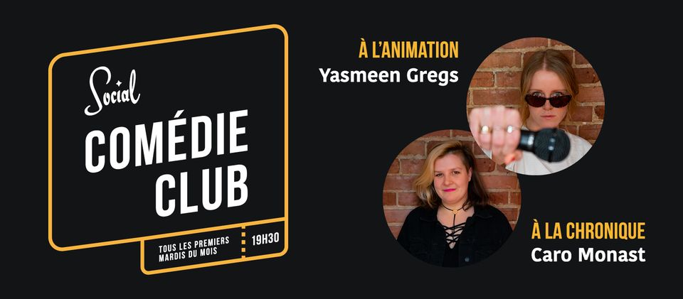Le Social Comédie Club est une soirée Open-Mic animée par Yasmeen Gregs avec Caro Monast à la chronique qui a lieu tous les premiers mardis du mois!