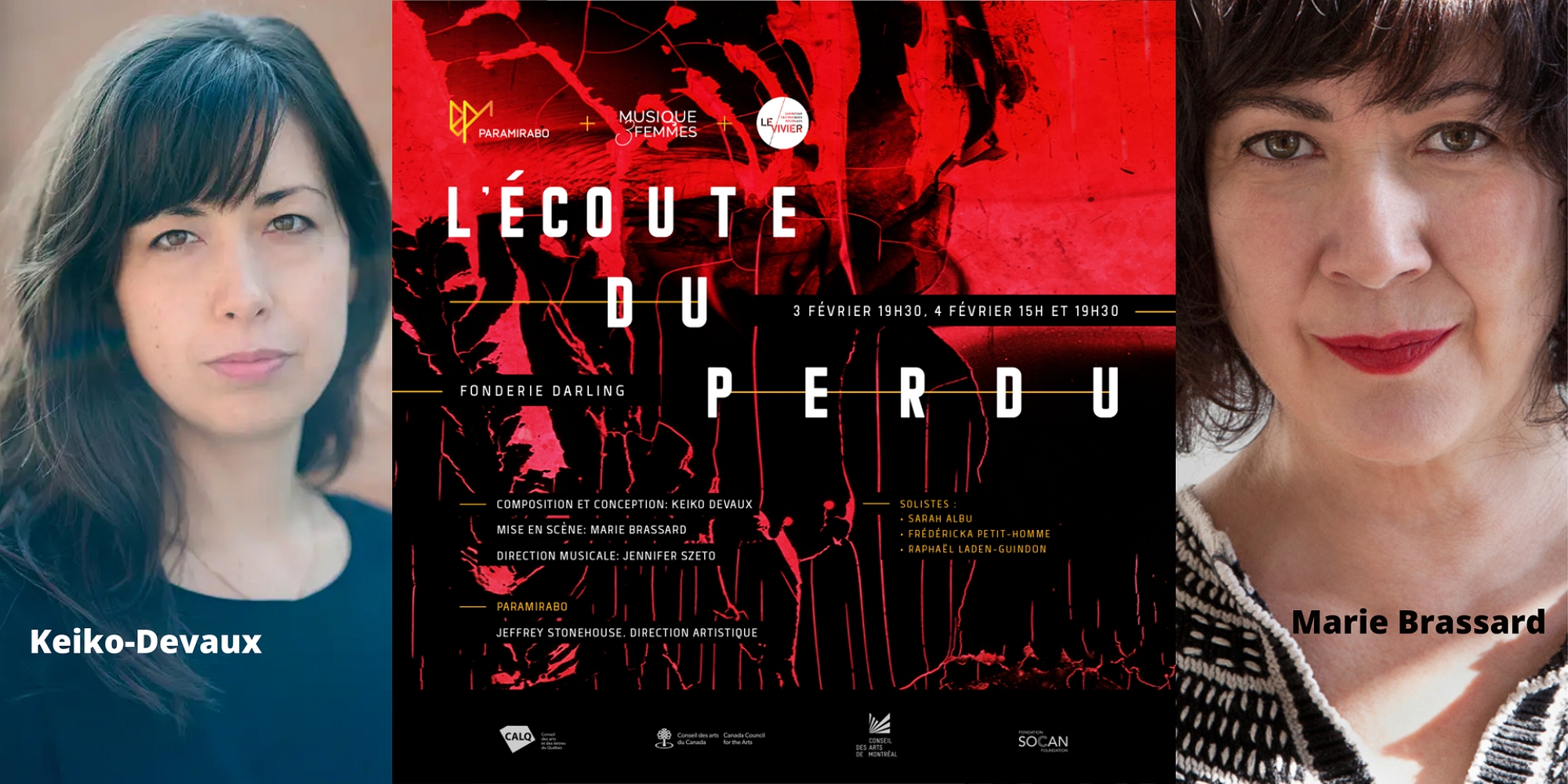Les 3 et 4 février prochains, Paramirabo présentera en coproduction avec Musique 3 Femmes et en codiffusion avec Le Vivier L’écoute du perdu en première mondiale à la Fonderie Darling. Cet opéra de chambre non narratif, expérimental et bilingue, mettra de l’avant une oeuvre lyrique majeure de Keiko Devaux, lauréate du Prix JUNO pour la meilleure composition de l’année 2022, et une mise en scène de la réputée Marie Brassard (Prix Siminovitch, 2022), reconnue pour son travail en tant que metteuse en scène.