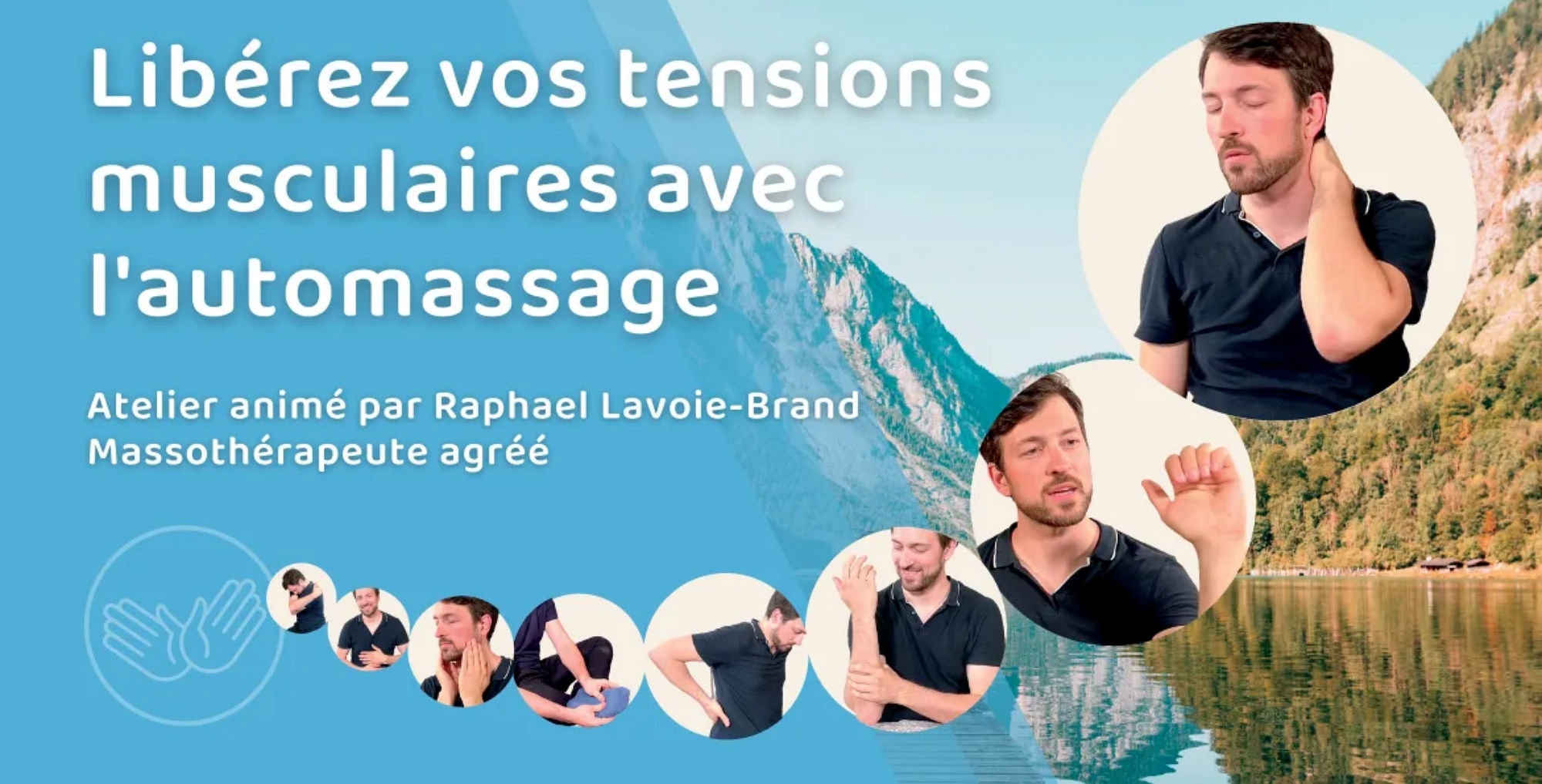 Dans cet atelier, vous apprendrez les techniques simples et efficaces d’un massothérapeute reconnu, spécialisé dans l’enseignement de l’automassage. Tout au long de la séance guidée, des notions anatomiques et les principes du massage vous aideront à développer un véritable outil pour prendre soin de vous.