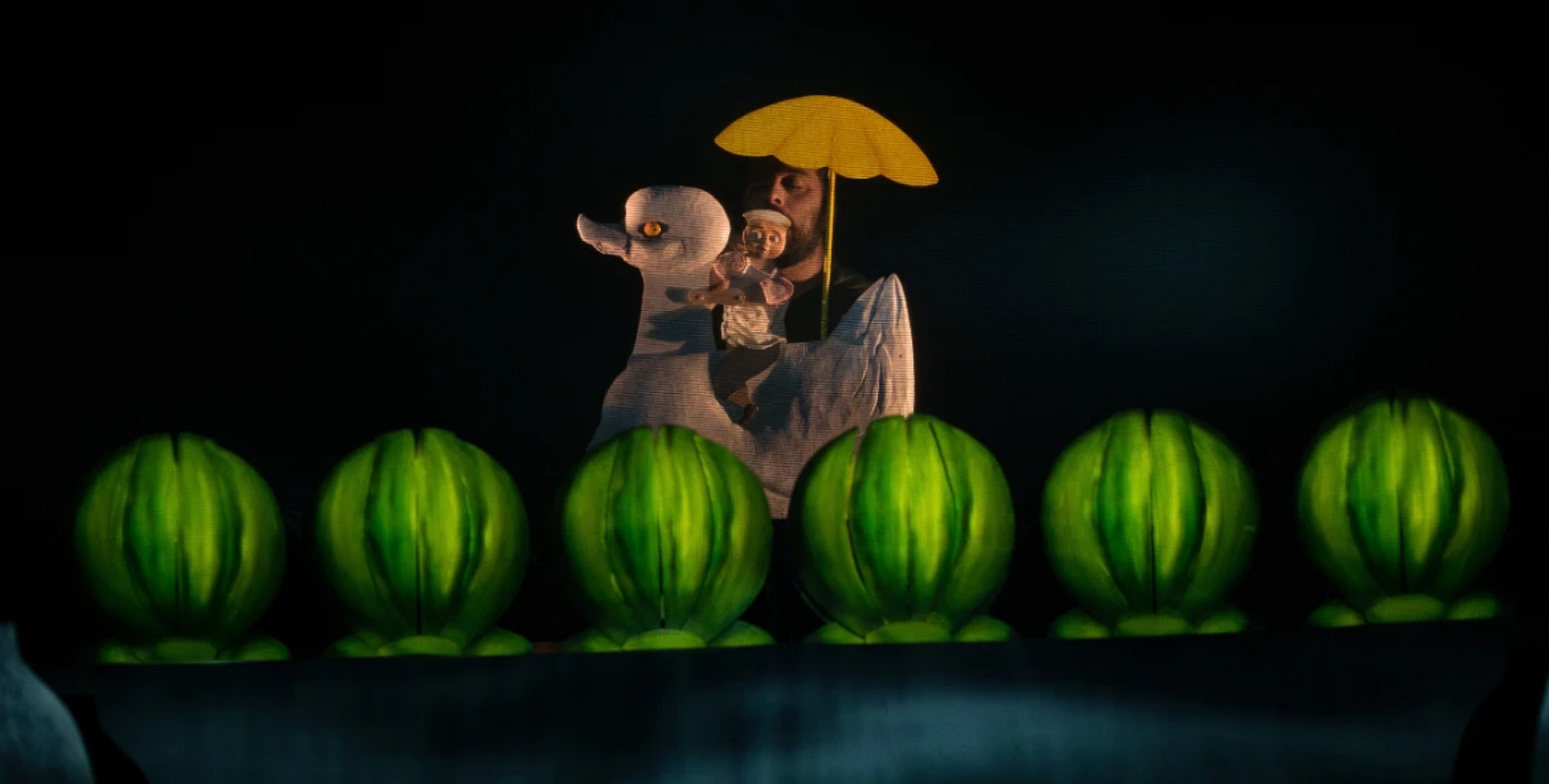 Aussitôt, poussé par le vent de l’inspiration, le Roi de la patate s’envole, accroché à son parasol… Un brouillard magique descend alors sur le Lac Bellevue. Chevauchant un grand canard blanc, on découvre un lac transformé par l’esprit du Poète: une grenouille amoureuse d’un nénuphar, une épave gardée par un monstre marin, une mystérieuse couronne à cinq étoiles et une île inconnue sur laquelle le Roi de la patate règne comme un vrai Roi! Mais à l’horizon, le fantôme de Vagalâme et l’infâme Roi des Mouches approchent…