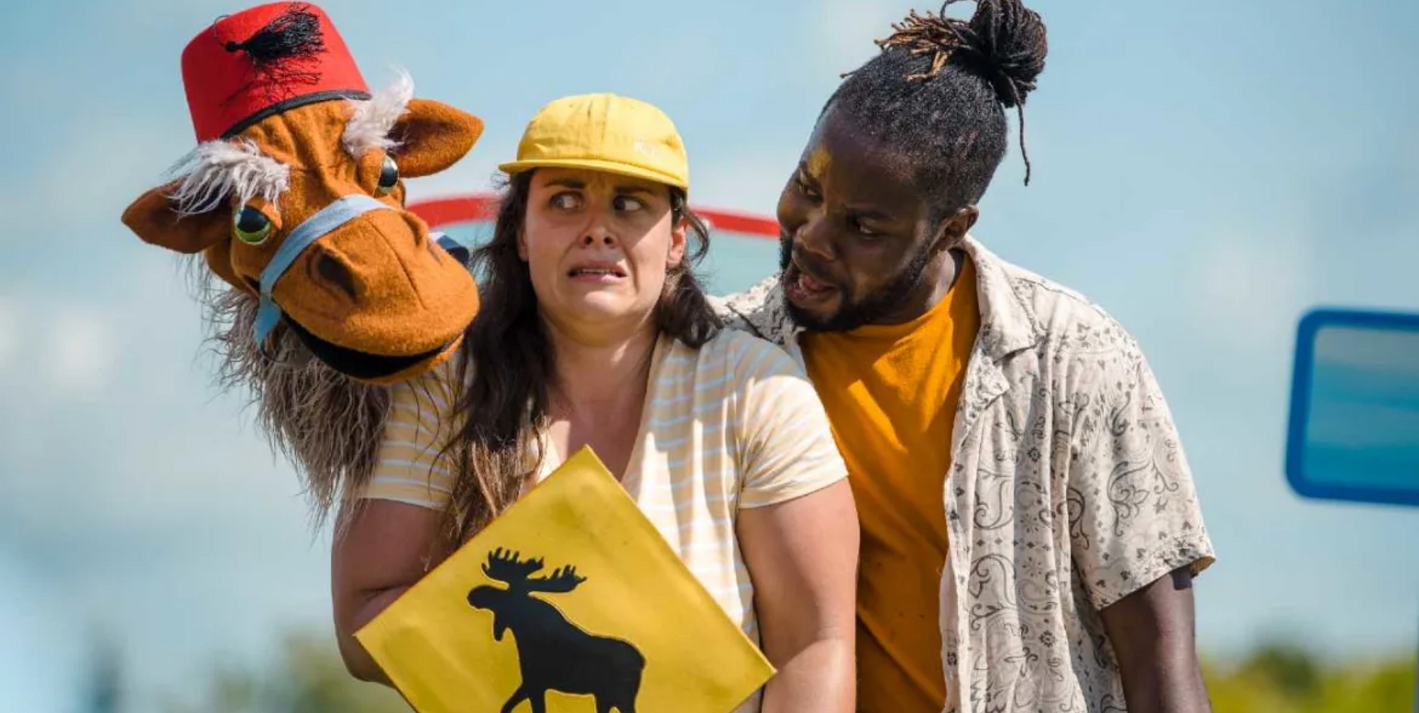 Momo, un chameau en peluche se retrouve coincé sur les rives de Baie-Comeau devant Chantal l’orignal, une pancarte routière malcommode.