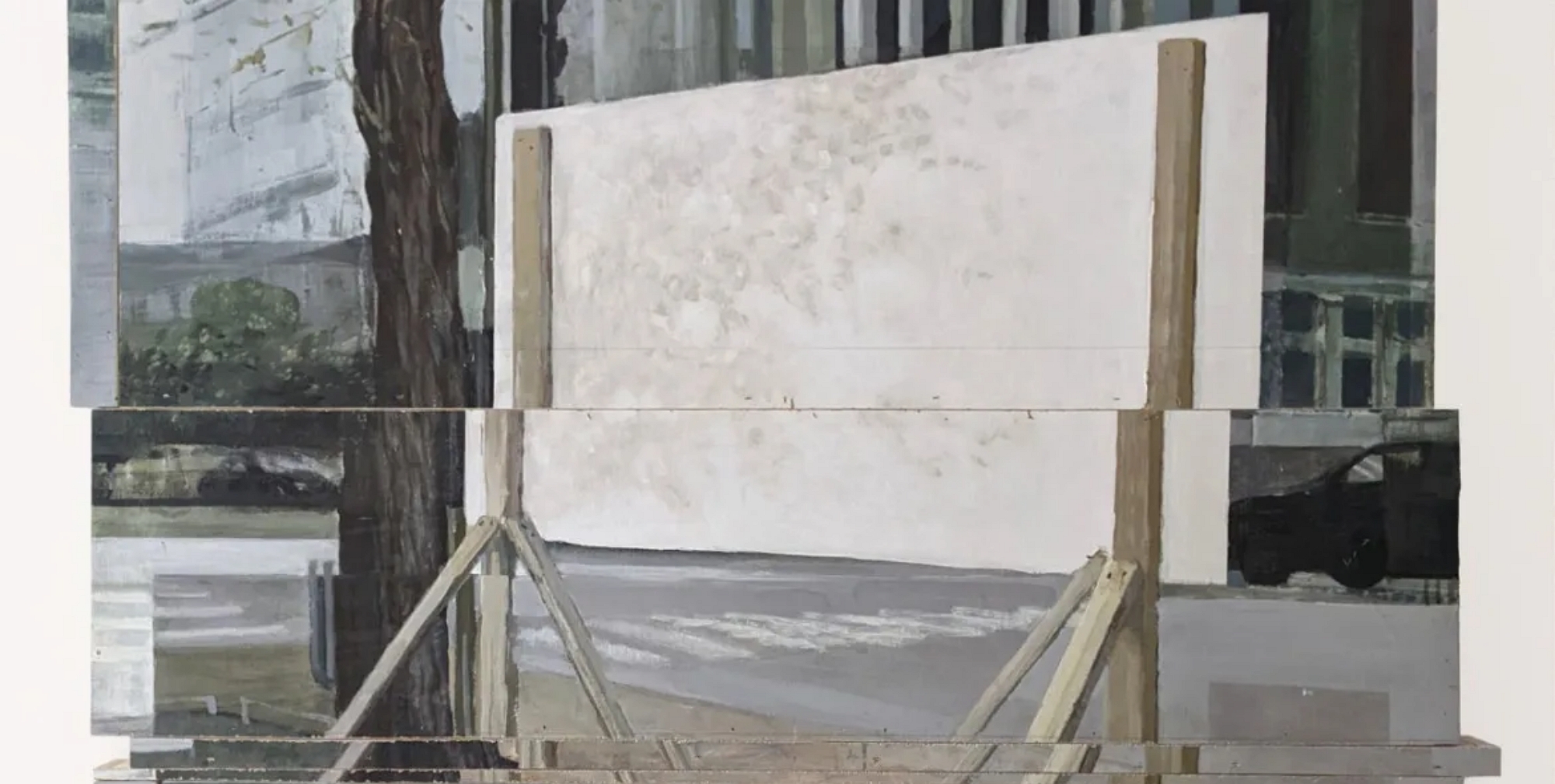 Fidèle à ses méthodes et machinations précédentes, les peintures y sont investies dans leurs intégrité picturale et physique. On y retrouve des tableaux sectionnés, disloqués, raboutés par des gestes d’addition et de soustraction de matière. Ces remaniements évoquent paradoxalement la nouvelle nature virtuelle de l’image et des glitches qui la recomposent lors d’altérations hasardeuses. À travers ces machinations anxieuses, l’artiste développe une imagerie sur les thèmes de la communication de masse, du développement urbain et de la propriété privée.