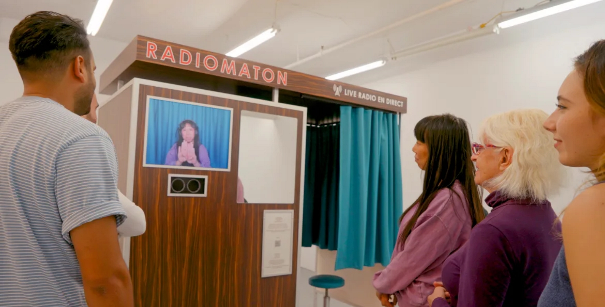 Installé(e) dans une cabine individuelle de type photomaton et équipé(e) d’écouteurs diffusant une radio locale, chaque utilisatrice et utilisateur de Radiomaton doit répéter à voix haute les mots qu’elle ou il entend, tout en reprenant des gestes qui lui sont télésoufflés. Sa performance filmée, mêlant des mouvements et des mots qui ne s’appartiennent pas, est remixée dans un kaléidoscope vidéo où tous les sens s’entrecroisent.