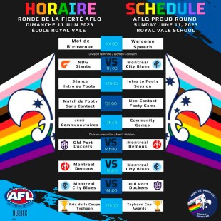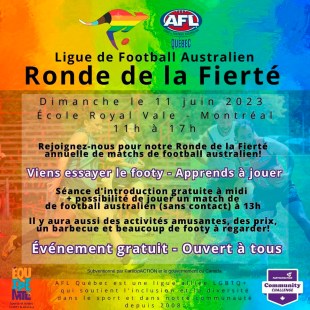 AFL Québec invite la population à se joindre à la ronde de la Fierté, un grand événement annuel permettant de célébrer la diversité dans le sport et d’apprendre à jouer au football australien, aussi appelé « footy ». Cette journée se déroulera à partir de 11h00 au parc de l’école Royal Vale au 5851 avenue Somerled, à Montréal.