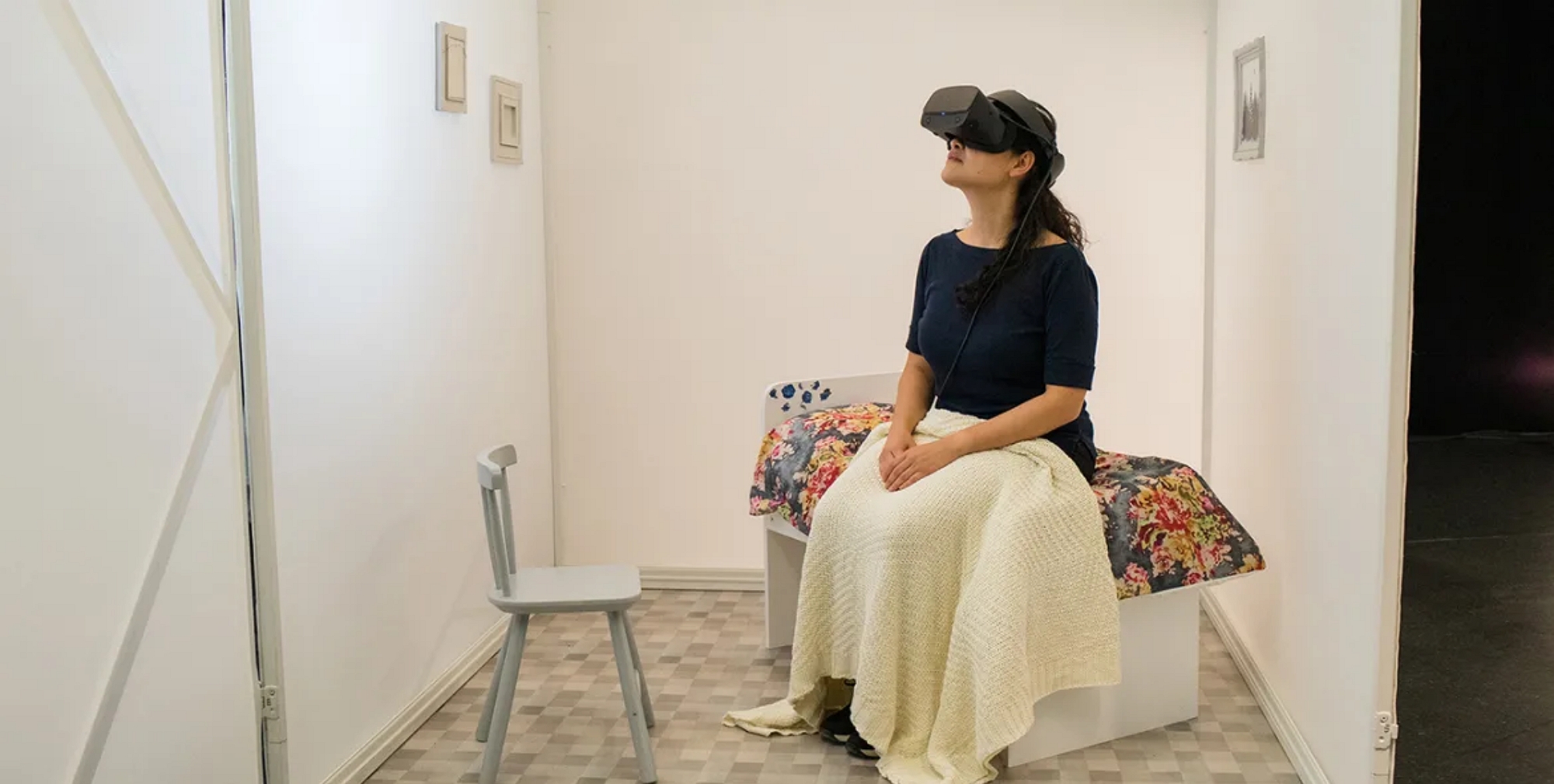 Entrez dans ce lieu comme chez une amie, placez sur votre tête le casque de réalité virtuelle. Observez un univers de neige et de forêt se déployer devant vos yeux, puis rencontrez cette mystérieuse femme-corneille.