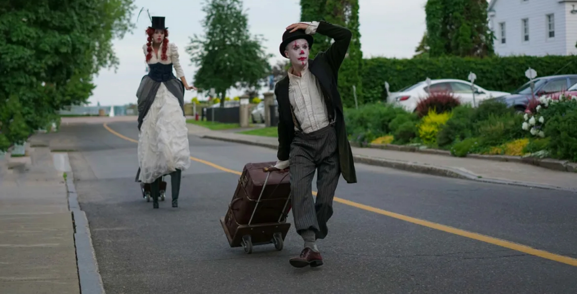 En intégrant le public sous les parapluies, un tableau d’ensemble et un théâtre de proximité sont à la fois créés, permettant ainsi une complicité avec les spectateurs et les protégeant de l’inévitable averse.