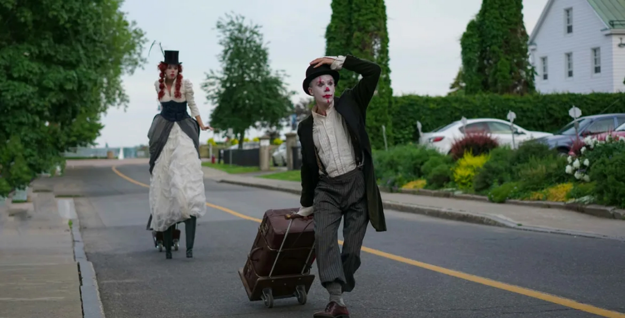 En intégrant le public sous les parapluies, un tableau d’ensemble et un théâtre de proximité sont à la fois créés, permettant ainsi une complicité avec les spectateurs et les protégeant de l’inévitable averse.