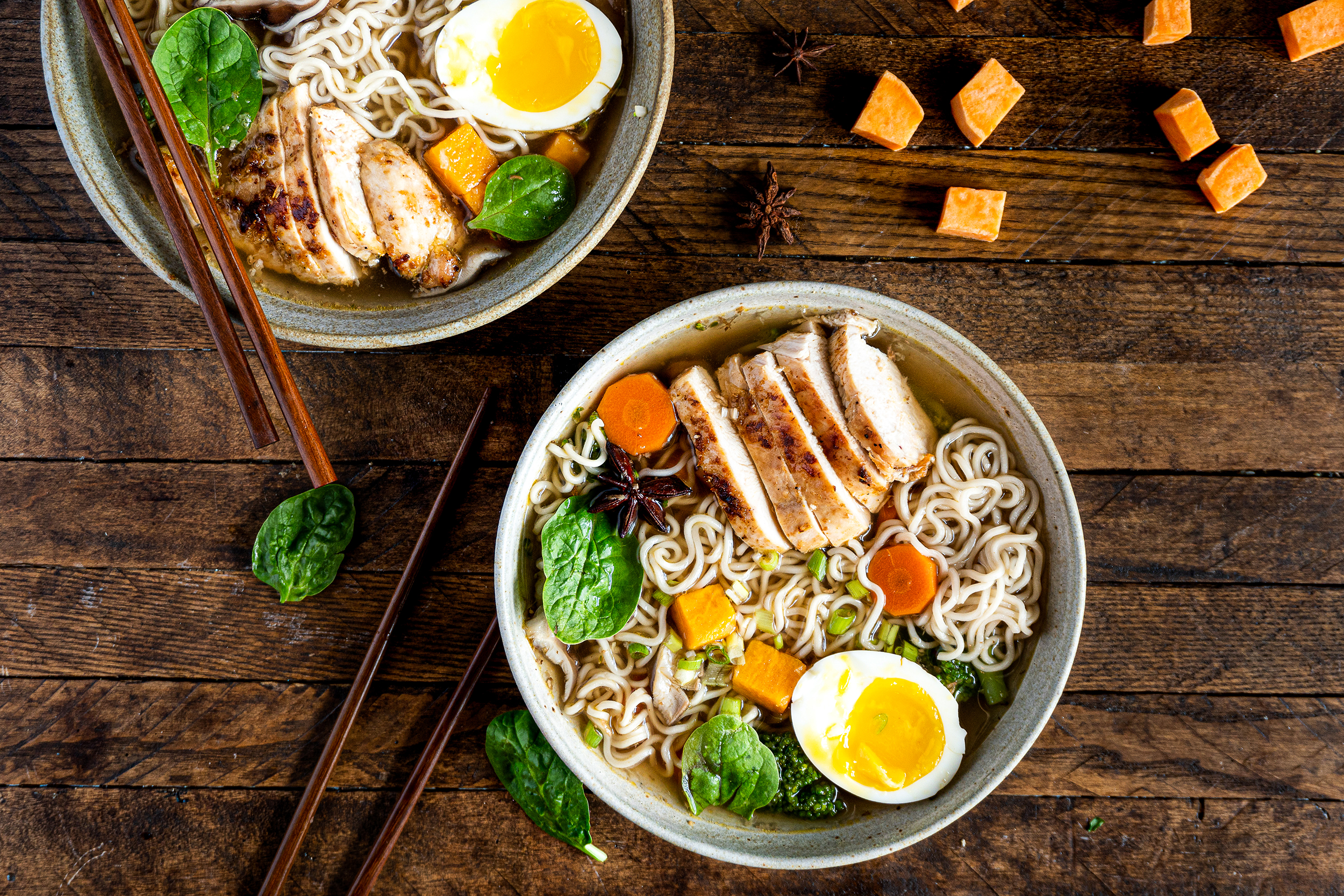 - Diviser les nouilles ramen dans 2 grands bols, verser le bouillon et les légumes, puis ajouter les tranches de poulet grillé.