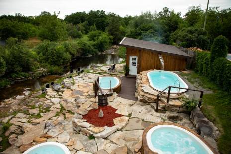 Évadez-vous à l’intérieur de sa crypte vapeur, construite sous forme de grotte en pierre, ou encore de sa banya russe, une exclusivité dans le domaine des spas des Cantons-de-l’Est! Profitez aussi de ses bains californiens, saunas finlandais et cascades nordiques, ainsi que de son accès sécurisé à la rivière et ses multiples aires de détente avec foyer.