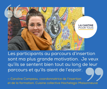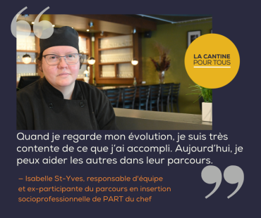 L’objectif? Offrir à des personnes confrontées à divers défis une expérience de travail pertinente, une occasion de se réaliser et un moyen d’intégrer le marché de l’emploi. Parfois même embauchées dans l’organisme où elles ont été formées, elles contribuent ainsi à leur tour au bien-être de la communauté, en facilitant l’accès à des repas sains et abordables, pour tous.