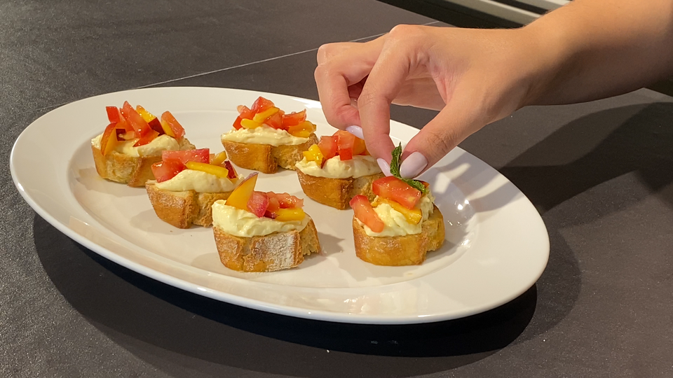 Pêche, menthe et fromage en bruschettas