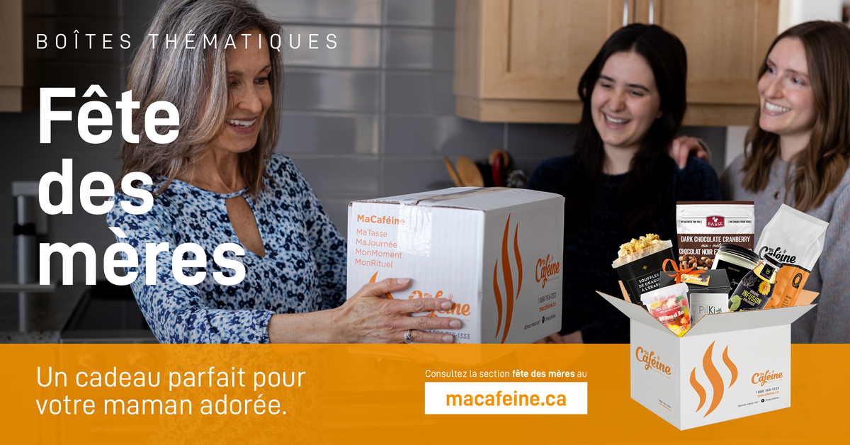 Pour la fête des Mères, Ma Caféine propose trois formats de boîtes-cadeaux : la Classique, la Bienveillante et l’Épicurienne. Créées dans l’idée de la stimulation des sens, elles contiennent des produits québécois axés sur le plaisir et le bien être : café, thé, parfum d’ambiance, chocolat, popcorn, beurre d’érable, bougie parfumée… de quoi choyer votre maman adorée.